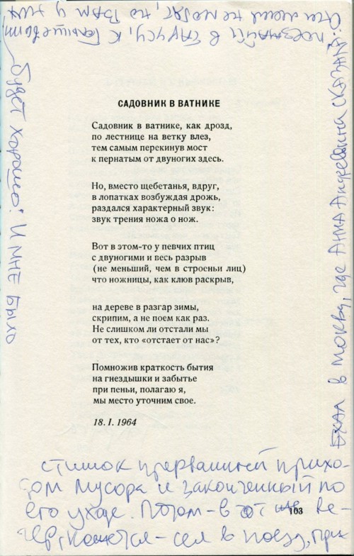 «Анна Андреевна сказала: поезжайте в Тарусу, к Голышевым. Они меня не любят, но Вам у них будет хорошо. И мне было» – написал Иосиф Бродский на странице со стихотворением «Садовник в ватнике» в ардисовском издании сборника «Остановка в пустыне» (1989). По периметру на полях – комментарий поэта - «Стишок, прерванный приходом ...