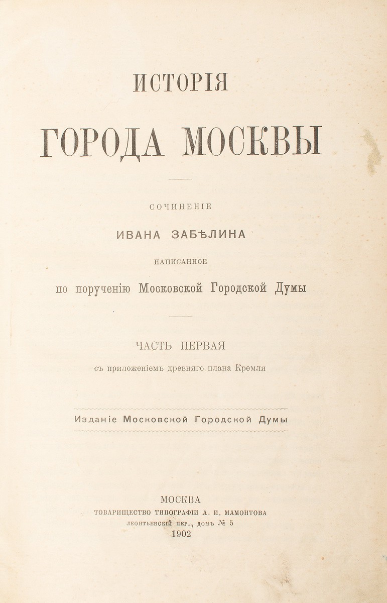 Забелин, И.Е. История города Москвы / Соч. Ивана Забелина, написанное по поручению Московской городской думы. - Ч. 1 [единственная]. - М.: Т-во тип. А.И. Мамонтова, 1902.