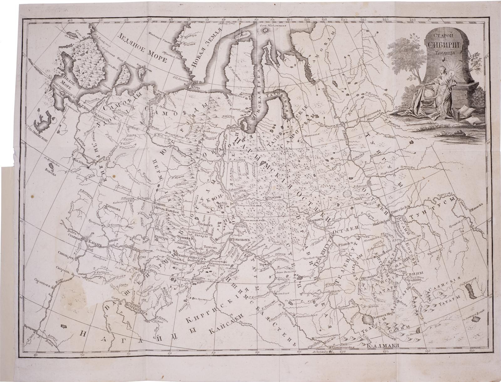 [2], 631 с., [1] л.карт.; 24,7х19,8 см. Раскладная гравированная карта Старой Сибири. Гравированные заставки, концовки, инициалы. В коричневом цельнокожаном переплете эпохи. На передней крышке вытиснено золотом: «Михаила Еропкина». На корешке 4 бинта, красная кожаная наклейка, где вытиснено золотом название книги и виньетки в виде цветов.Тит. л. дублирован (бумага), следы от круглого шт. на с. 1, дублирование с. 631, реставрация с. 629-630, пометы орешковыми чернилами на титульном листе, утрата 1 карты, бледные разводы по полям некоторых страниц. Сохранность хорошая.