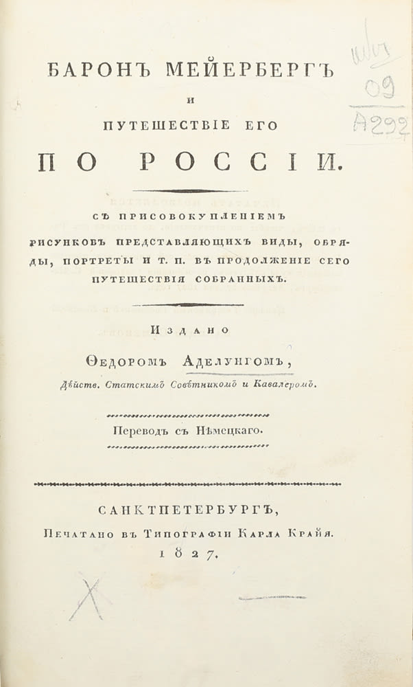 1827. – VIII, 374 с.; 21,8х13,8 см. В полукожаном переплете эпохи. Влад. надпись на нахзаце. След от стертого номера на с. 17. След от бум. наклейки передней крышке и на обратной стороне своб. л. форзаца. Шт. на форзаце.