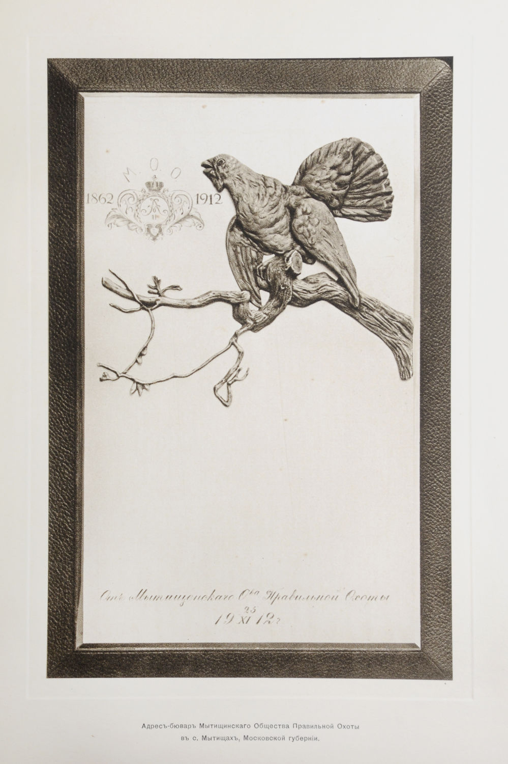 Созданное в 1862 г. на основе Московского Кружка охотников, Московское Общество охоты в 1912 году отмечало пятидесятилетний юбилей. Настоящее издание освещает торжественные мероприятия, приуроченные к празднованию. Над оформлением книги работал художник Борис Васильевич Зворыкин (1872-1942), 1892 году ставший членом Общества. Межд. книга. Кат. № 23: Русские антикварные книги. № 241.