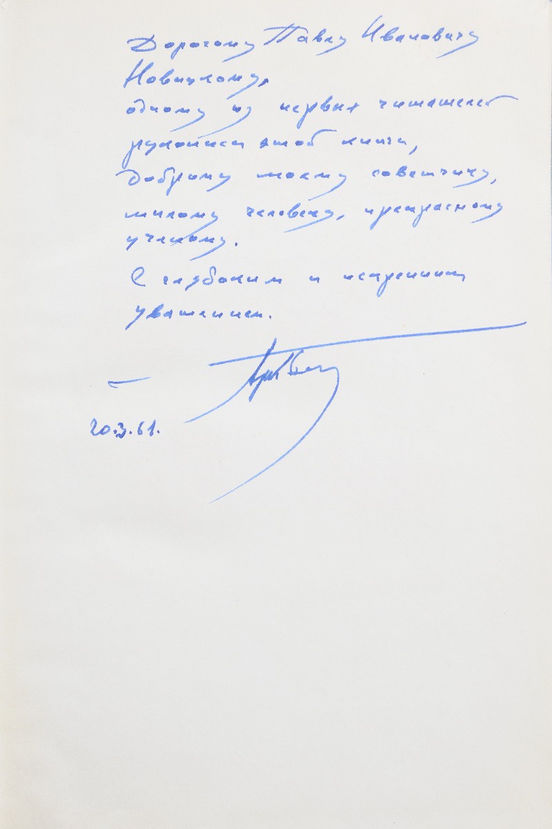 В издательском коленкоровом переплете. Дарственная надпись автора на свободном листе форзаца : «Дорогому Павлу Ивановичу / Новицкому / одному из первых читателей / рукописи этой книги, / доброму моему советчику / милому человеку, прекрасному / ученому. / С глубоким и искренним / уважением. / Арбелинков / 20.3.61». Адресатом надписи является Павел Иванович Новицкий (1888-1971), искусствовед, театральный критик, литературовед, педагог.