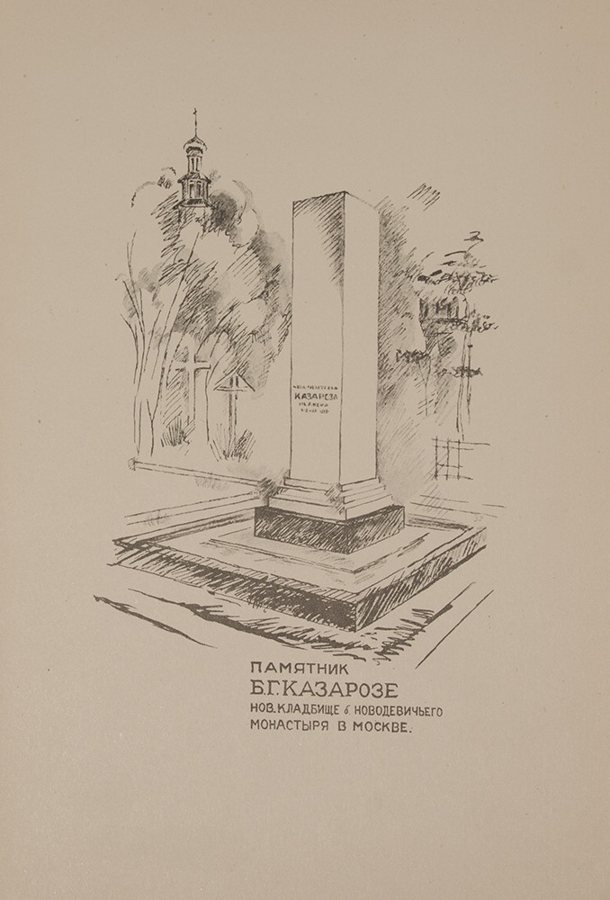 Экземпляр № 369. К изданию приложена иллюстрация «Памятник Б.Г. Казарозе». В издательском коленкоровом переплете и суперобложке. Фронтиспис выполнен в технике офорта художником Игнатием Нивинским.
