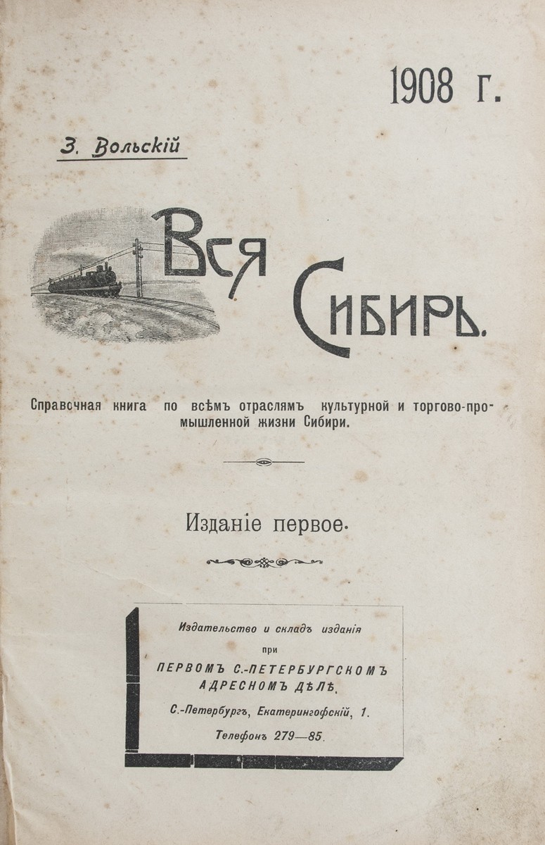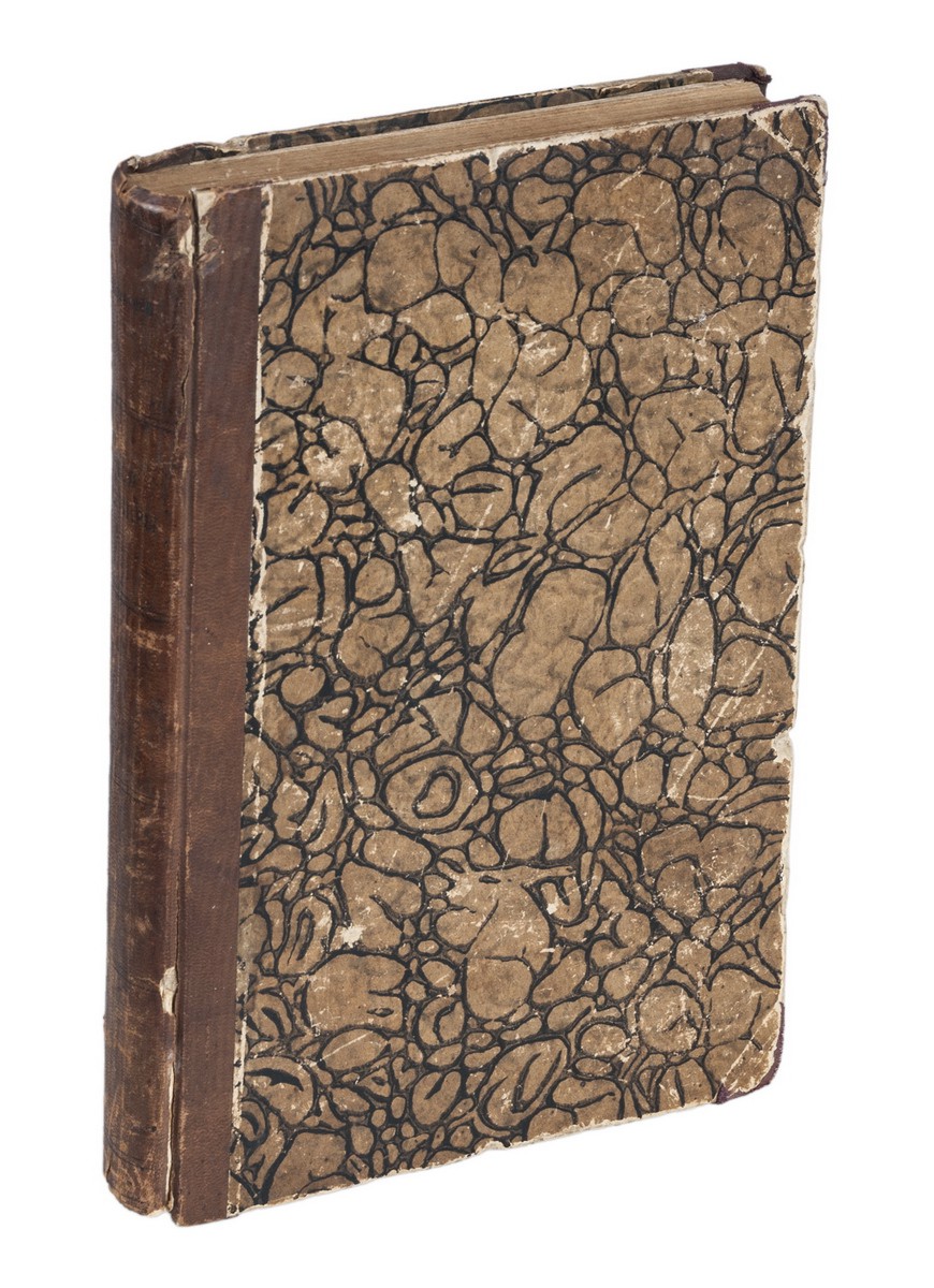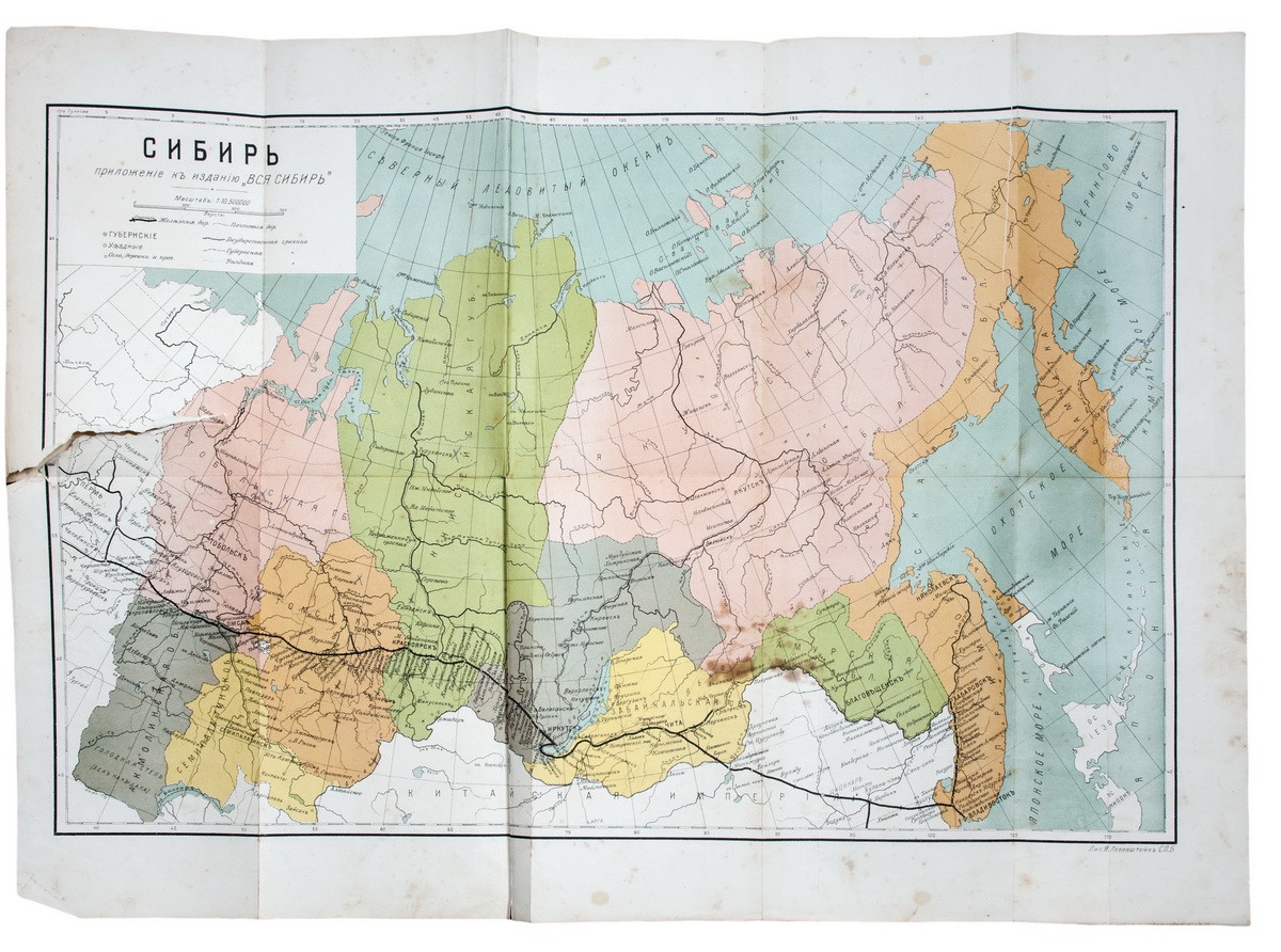 Карта Сибири на раскладном листе в конце книги. В полукожаном переплете эпохи. Трещины вдоль корешка, утрата своб. л. форзаца, надрыв карты у линии сгиба, «лисьи» пятна на первых и последних страницах.