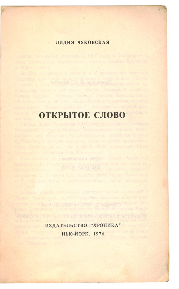 Лидия Корнеевна Чуковская (урожденная Лидия Николаевна Корнейчукова; 1907-1996) — редактор, писательница, поэт, публицист, мемуаристка, диссидент. Дочь Корнея Чуковского.