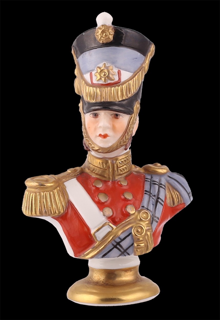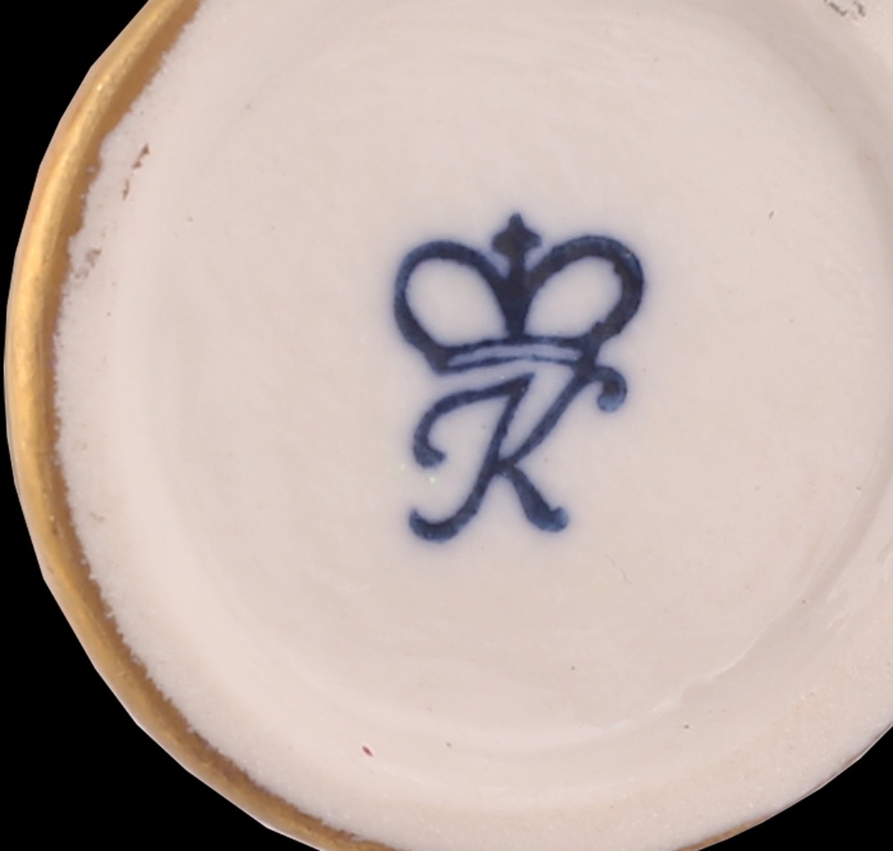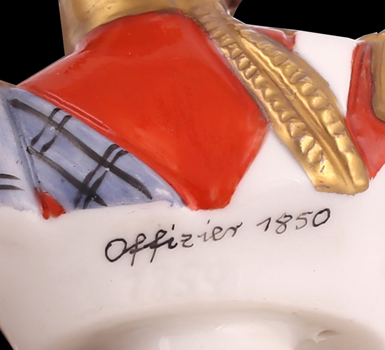 Германия. Фолькштедт (Volkstedt). Фабрика Rudolf Kämmer. Фарфор, лепка, роспись полихромными красками, роспись золотом. Марка: синяя подглазурная «К» под короной и арабская цифра «4» под ней. Надпись на задней поверхности фигуры: «Offizier 1850», под ней - цифра «1859» в тесте. Высота - 9,5 см, диаметр основания - 3 см.