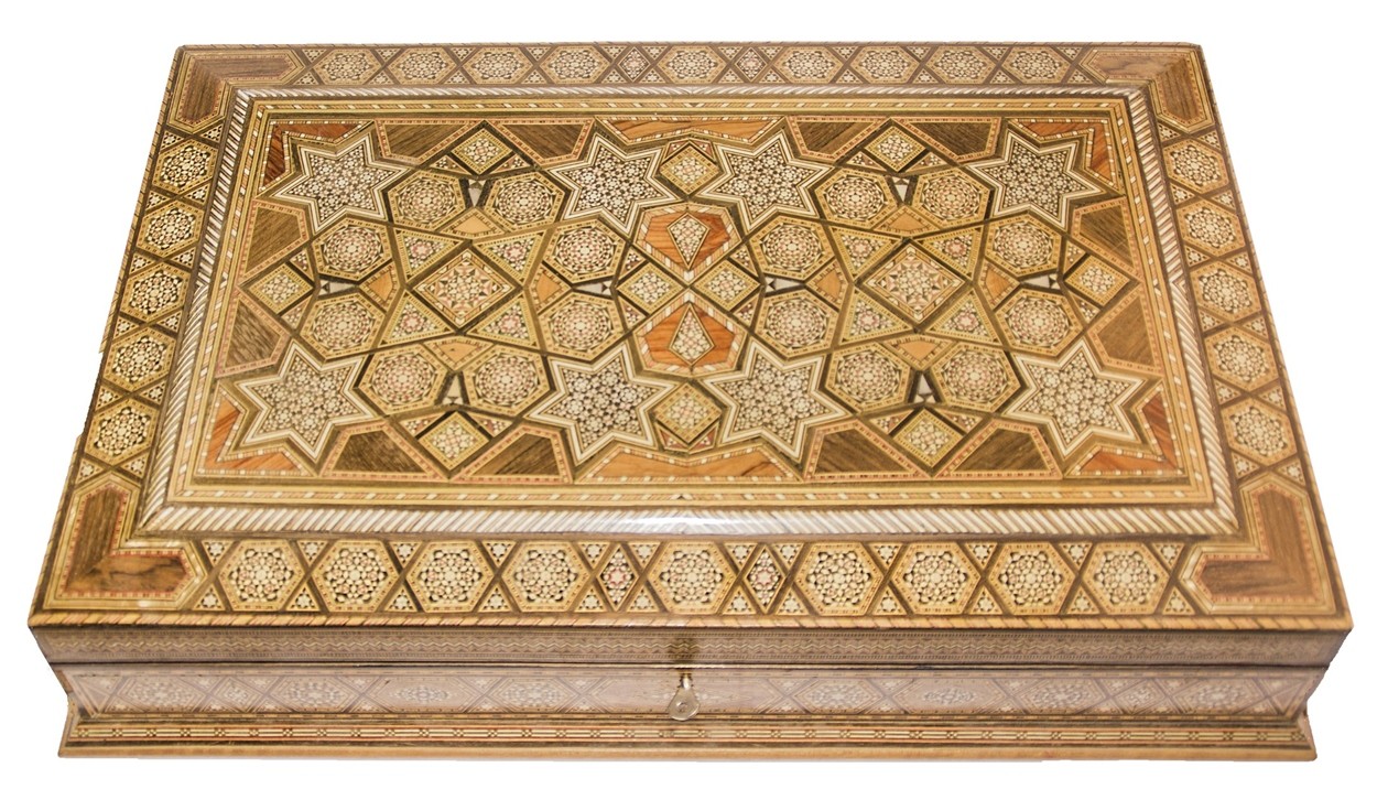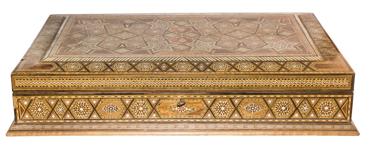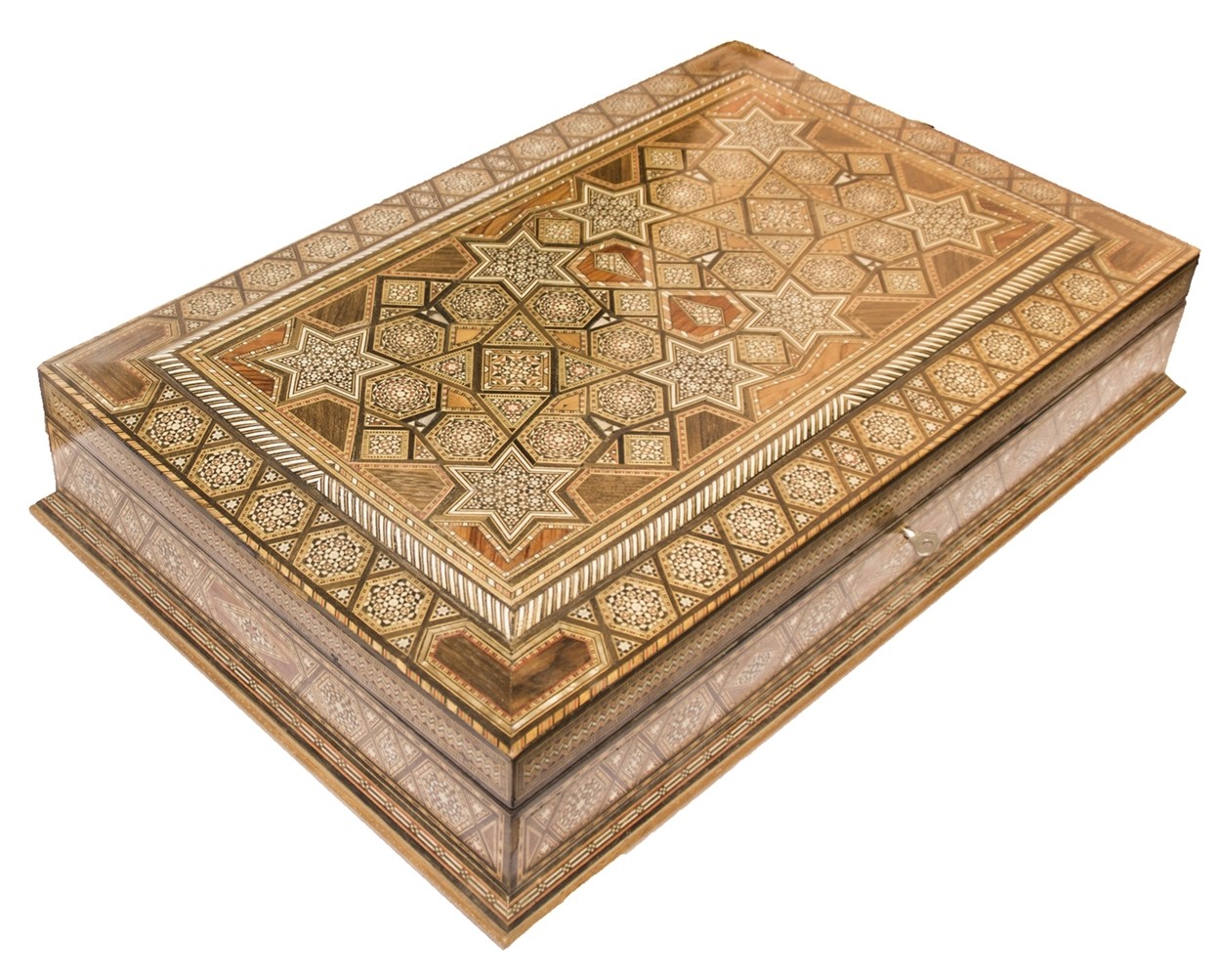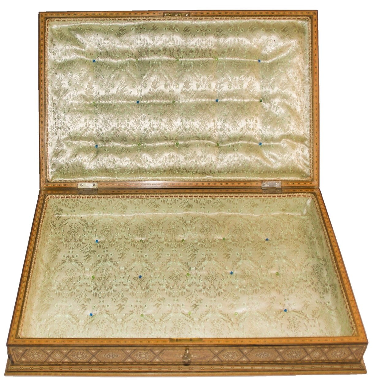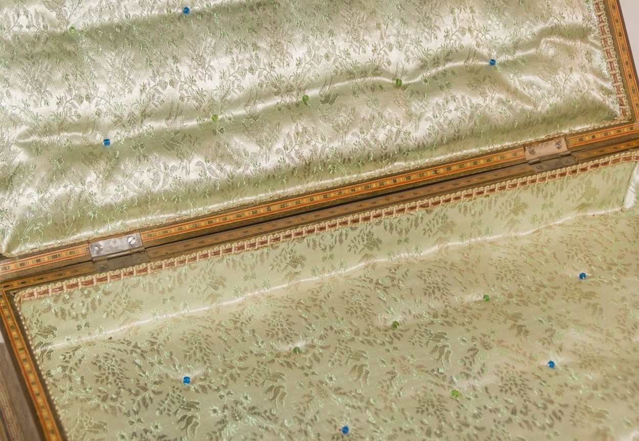 ОАЭ. 1950-е. Дерево, перламутр, лак. Внутренняя поверхность: Белый атлас, шитье. Размер: 11х55,5х35 см.