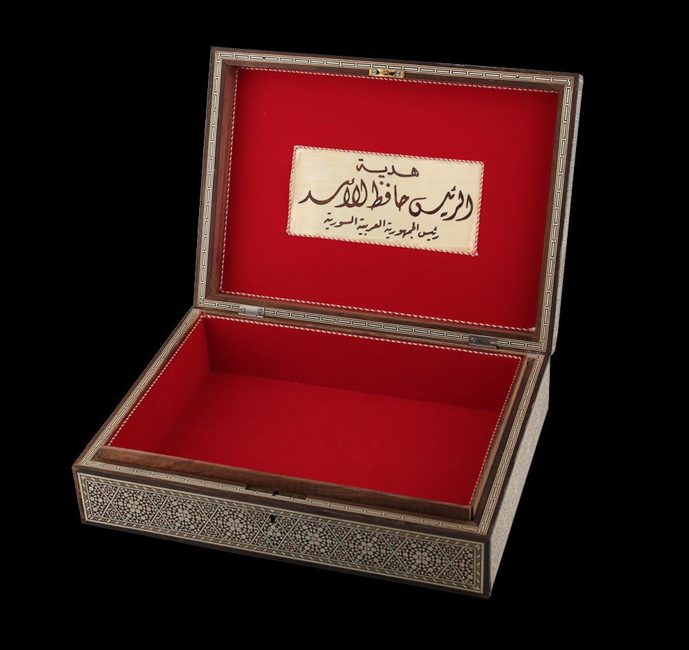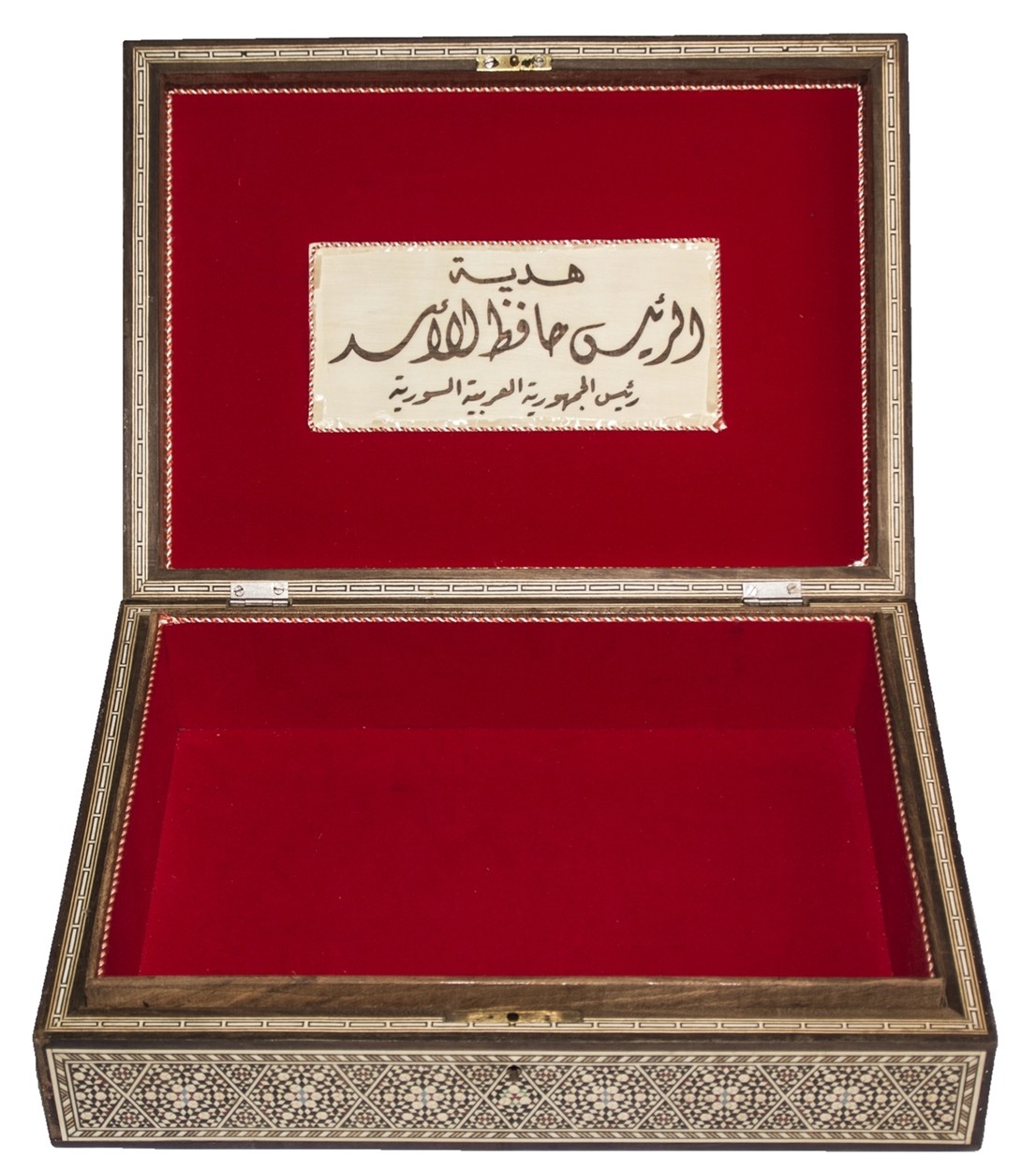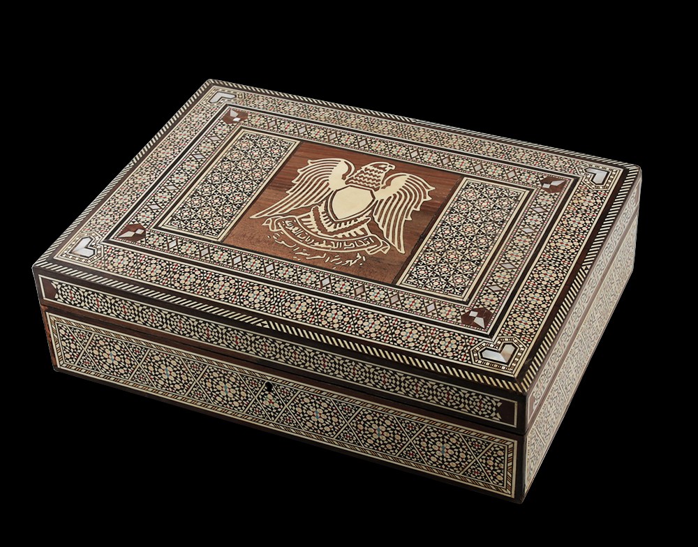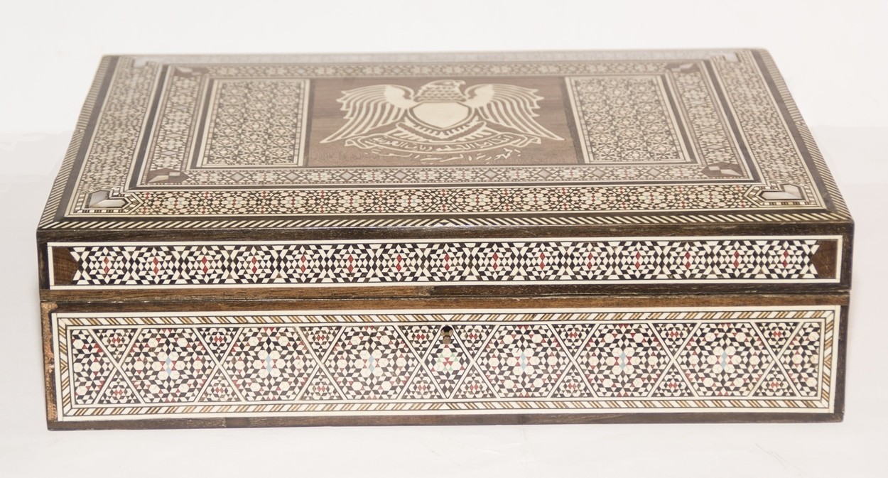 1950-е. Дерево, перламутр, лак. Внутренняя поверхность: красный бархат. Размер: 10х35х25 см. На верхней крышке герб Объединенной арабской республики.