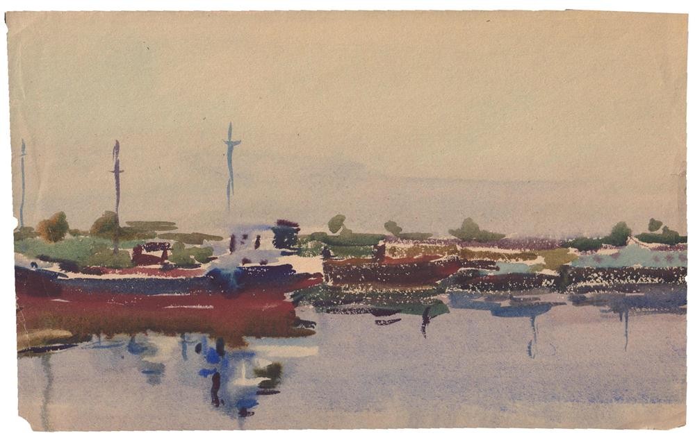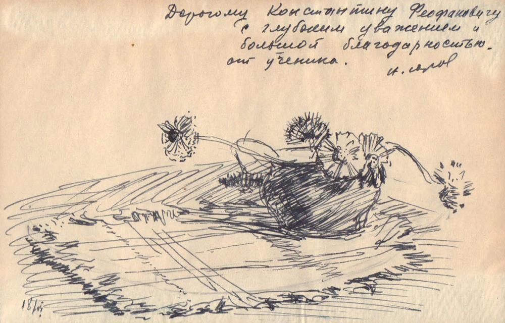 1. Два рисунка на картоне. «Судовая верфь» и «Маки». 1930-е. Бумага на картоне, тушь, перо. - 12х20 -10х17 см; В правом верхнем углу авторская надпиь: «Дорогому Константину Феофановичу / с глубоким уважением и / большой благодарностью / от ученика / И. Ялов» 2. Двусторонний рисунок «Судно на якоре». - 1930-е. Бумага, акварель. - 20х32 см.