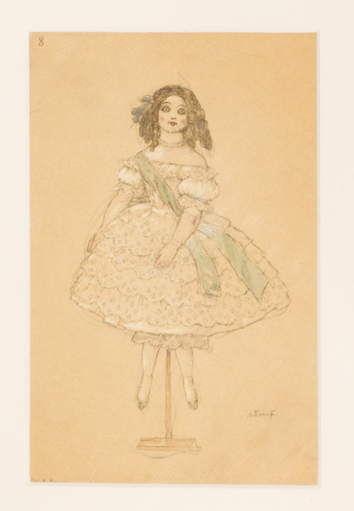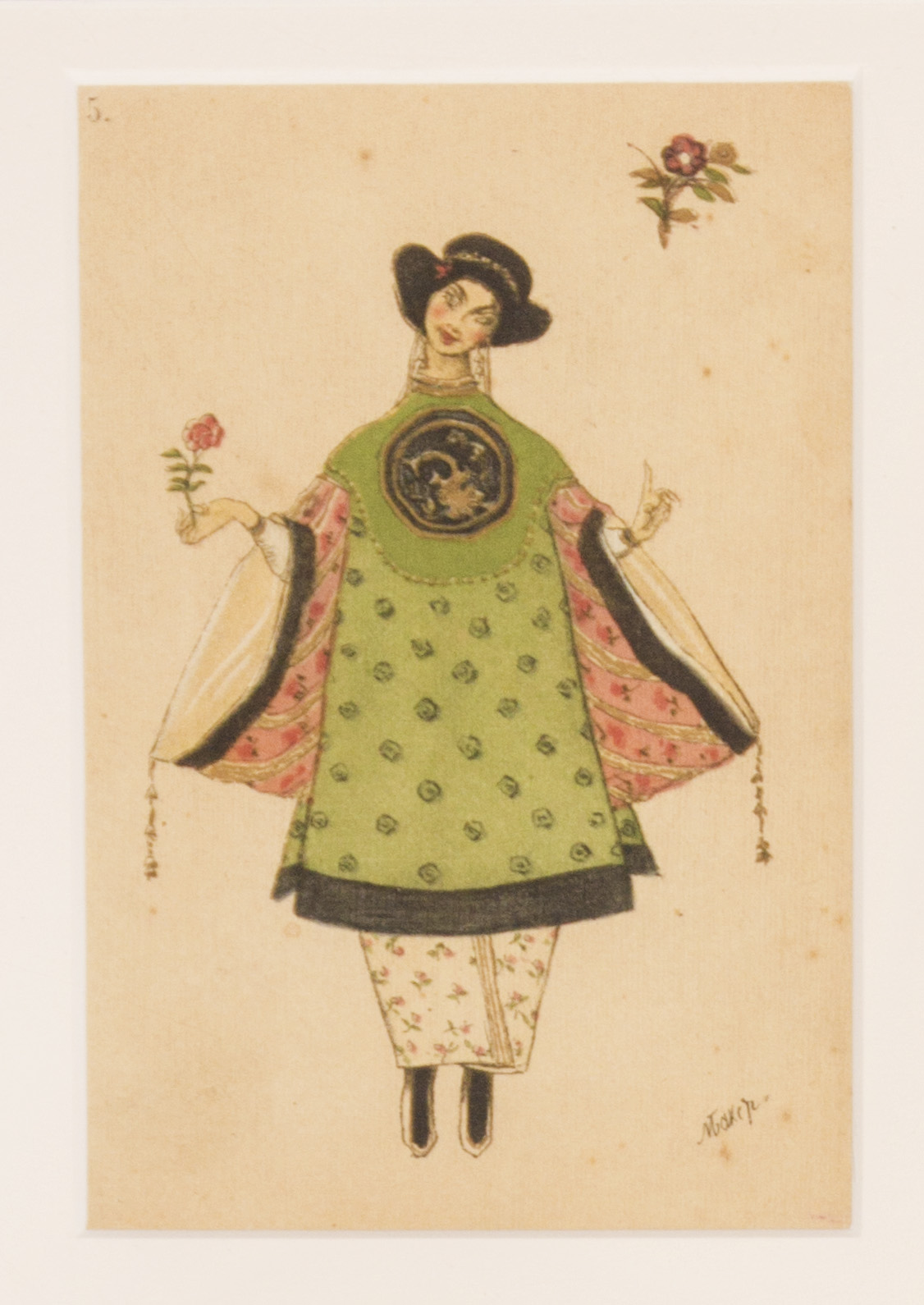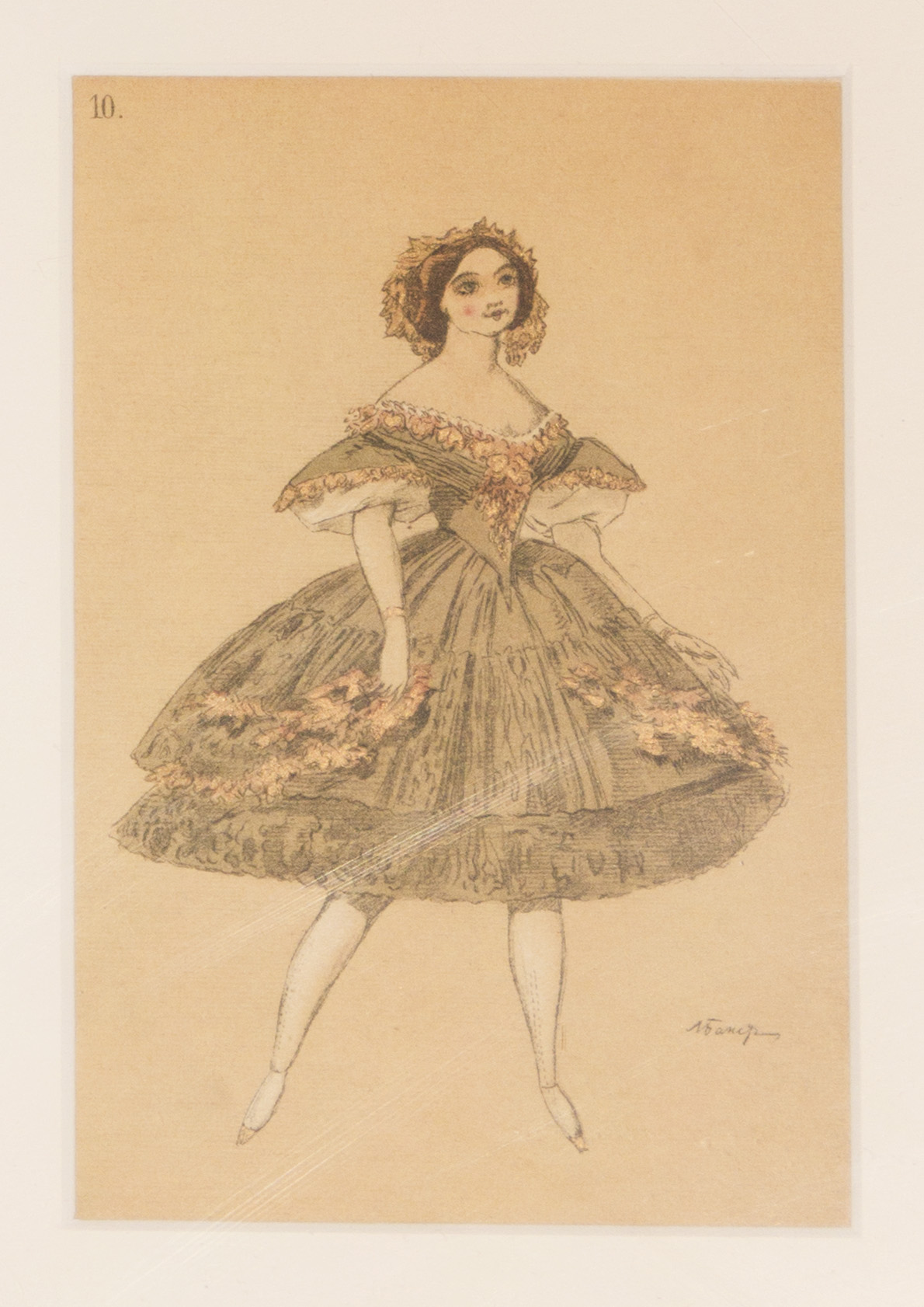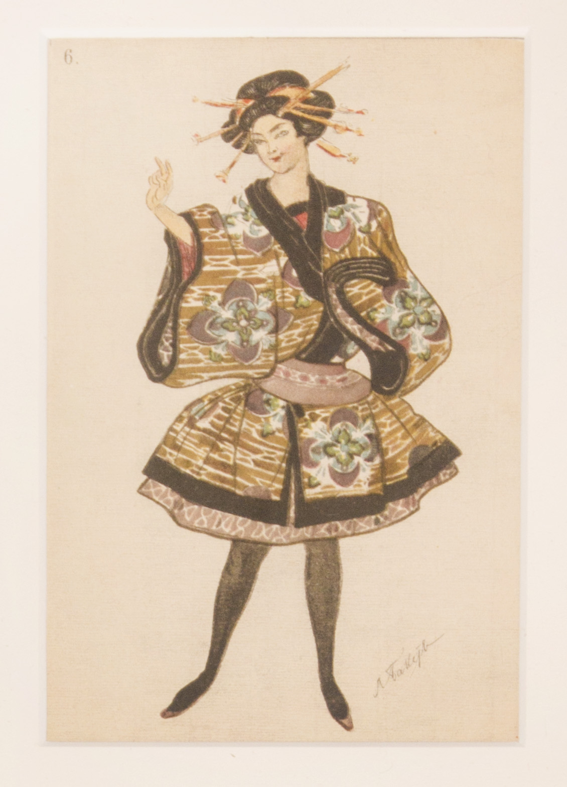 Лев Бакст в 1903 году выполнил декорации и эскизы костюмов к балету «Фея кукол» И. Байера, поставленному в Эрмитажном и Мариинском театрах. Вскоре после премьеры спектакля была издана серия открыток, в которой были использованы эскизы костюмов для постановки. Лев Самойлович Бакст (1866-1924) — художник, сценограф, иллюстратор и дизайнер, работавший преимущественно в Санкт-Петербурге и Париже. Мастер станковой живописи и театральной графики, участник объединения «Мир искусства» и театрально-художественных проектов С. П. Дягилева, один из законодателей европейской моды на экзотику и ориентализм в начале XX века.