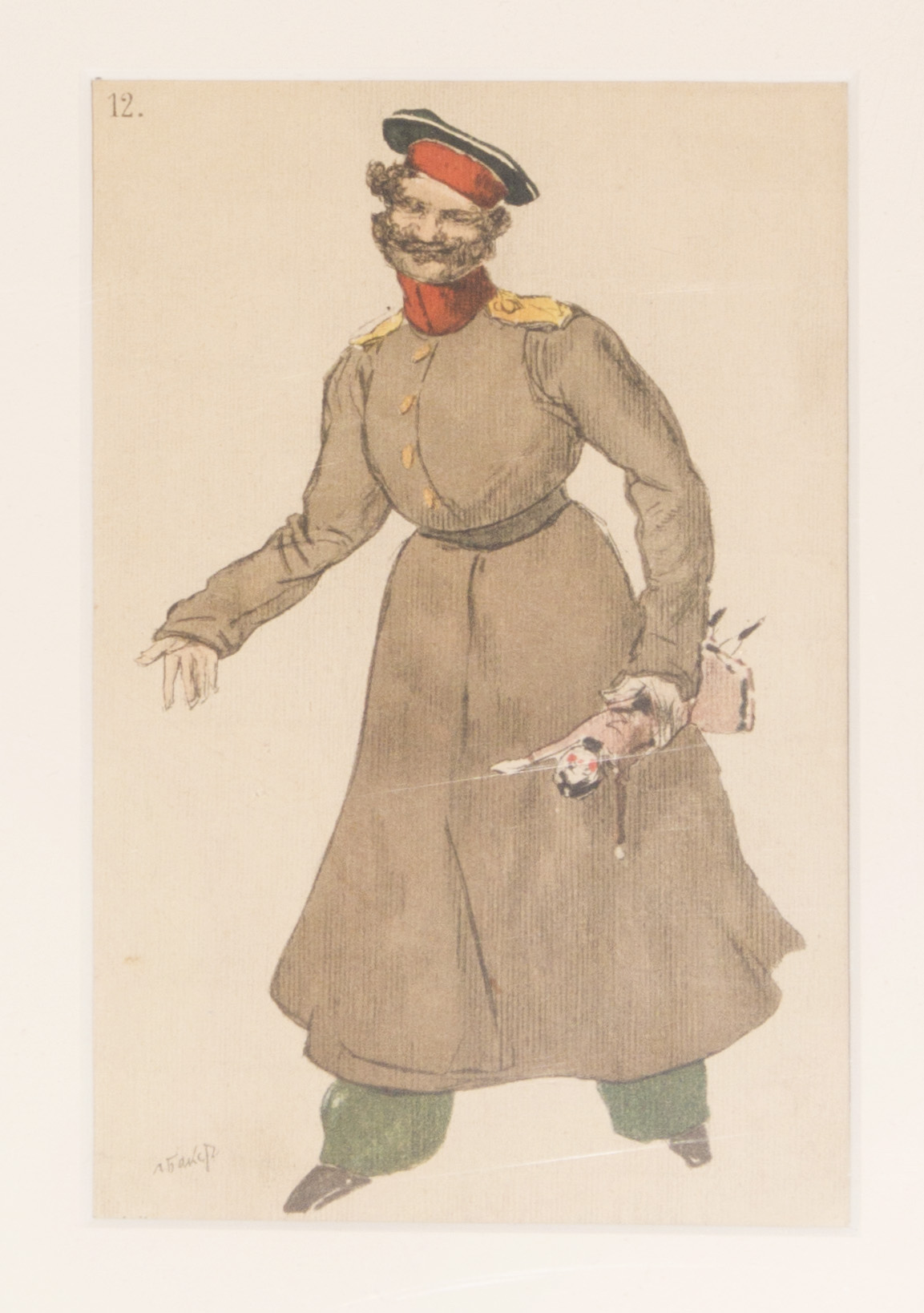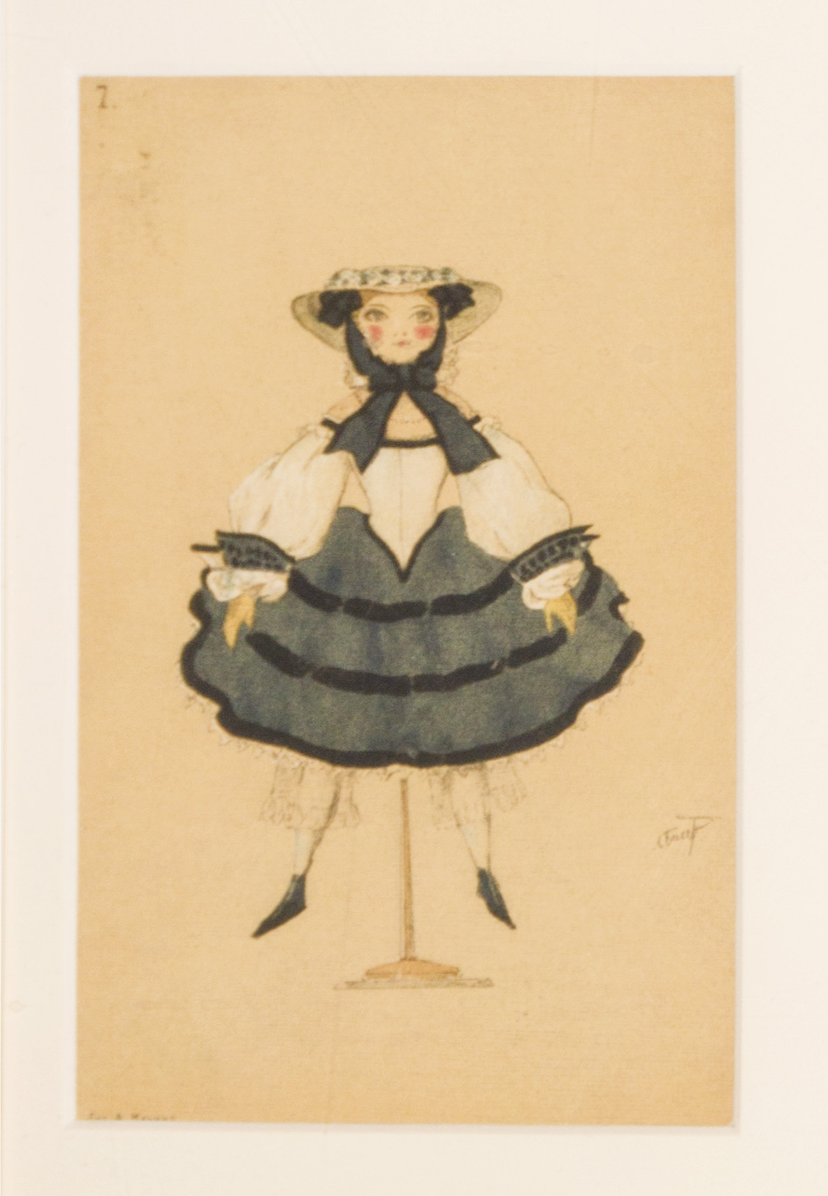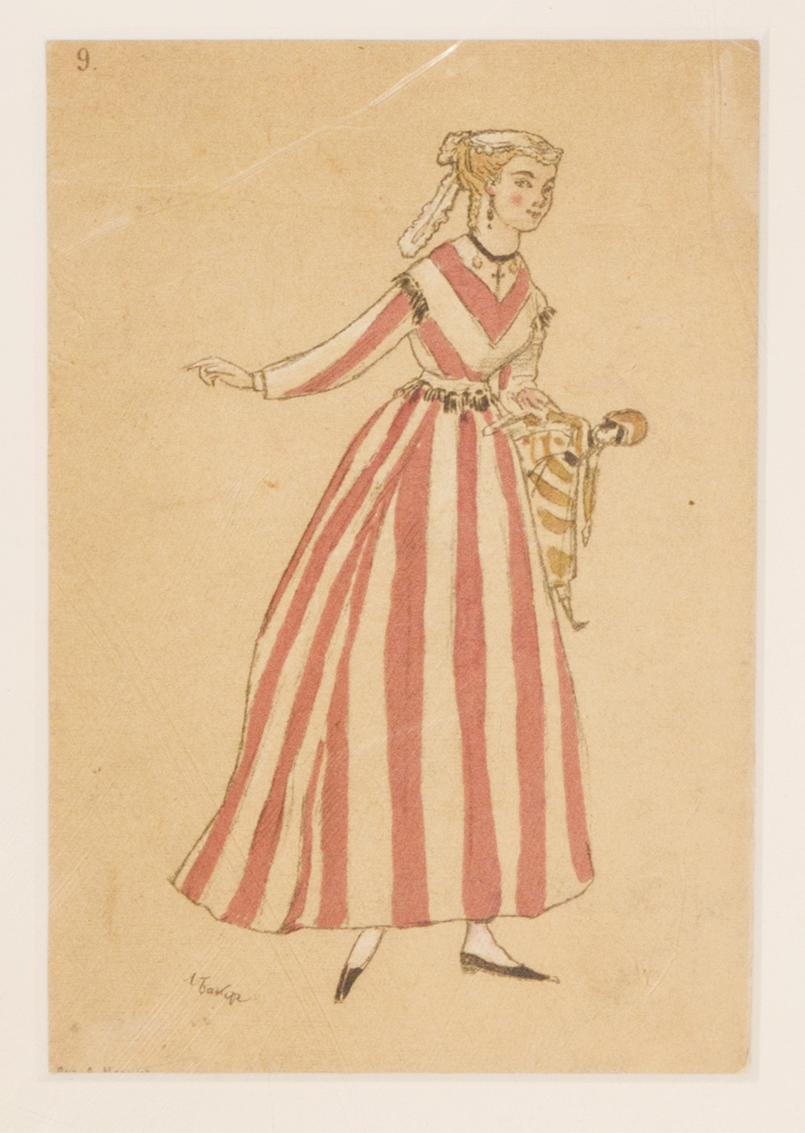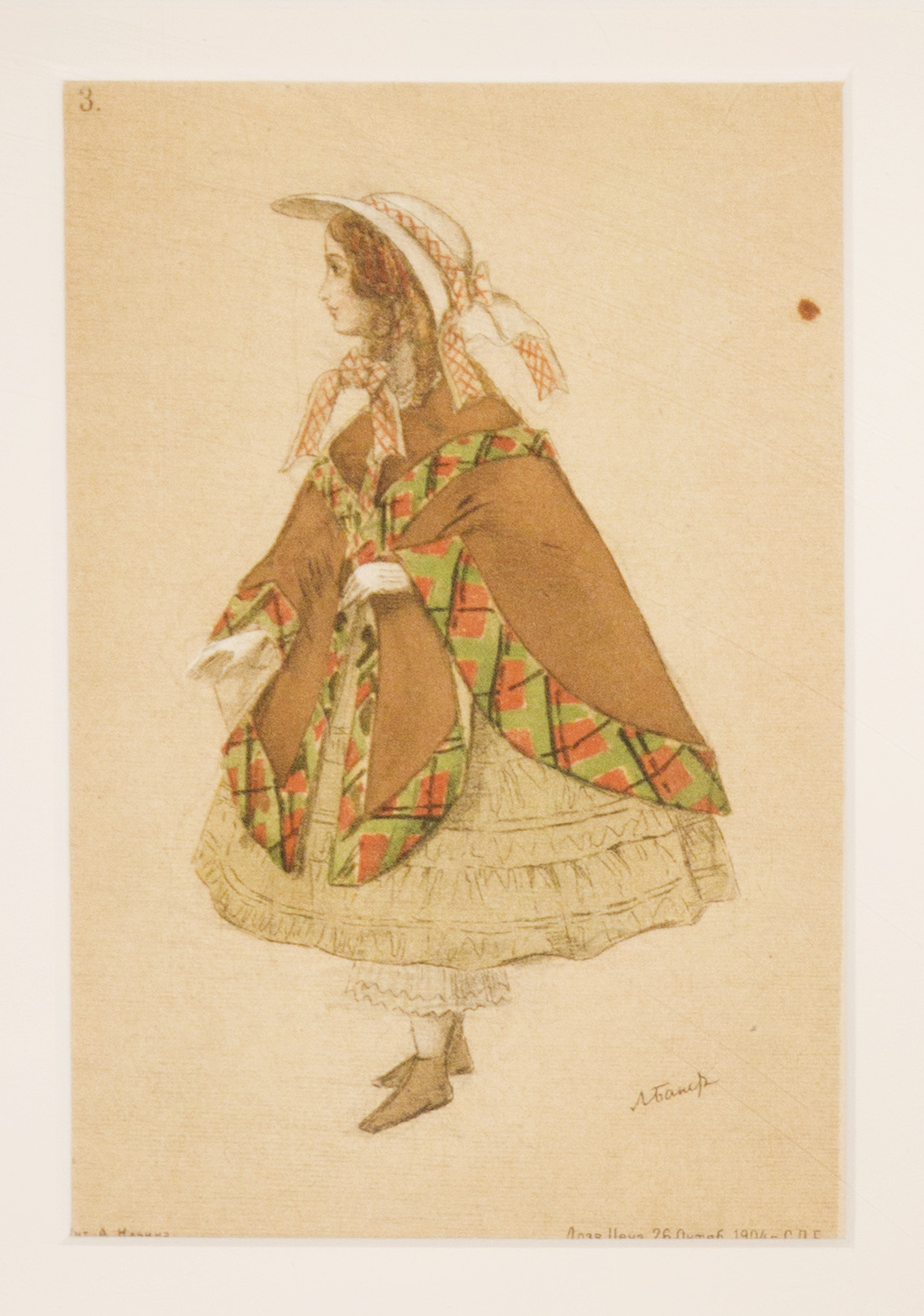 Лев Бакст в 1903 году выполнил декорации и эскизы костюмов к балету «Фея кукол» И. Байера, поставленному в Эрмитажном и Мариинском театрах. Вскоре после премьеры спектакля была издана серия открыток, в которой были использованы эскизы костюмов для постановки. Лев Самойлович Бакст (1866-1924) — художник, сценограф, иллюстратор и дизайнер, работавший преимущественно в Санкт-Петербурге и Париже. Мастер станковой живописи и театральной графики, участник объединения «Мир искусства» и театрально-художественных проектов С. П. Дягилева, один из законодателей европейской моды на экзотику и ориентализм в начале XX века.