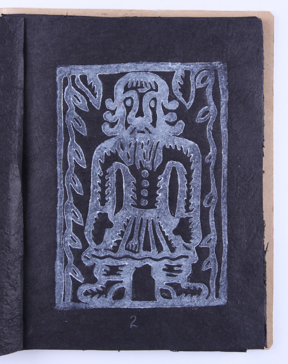 Концептуальная книга. В картонной папке.Бумага ручного литья, линогравюра (печать белой краской на бумаге черного цвета ручного литья).