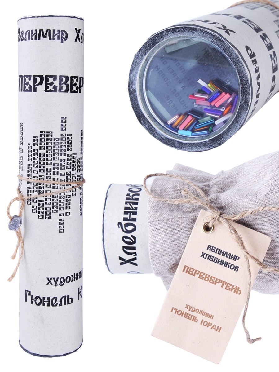 Книга-объект в форме шестизеркального калейдоскопа (32х6х6 см). Картон, бумага, калька, зеркала, веревка, принтер. Экз. №4.