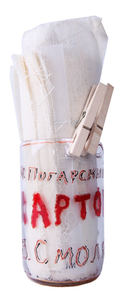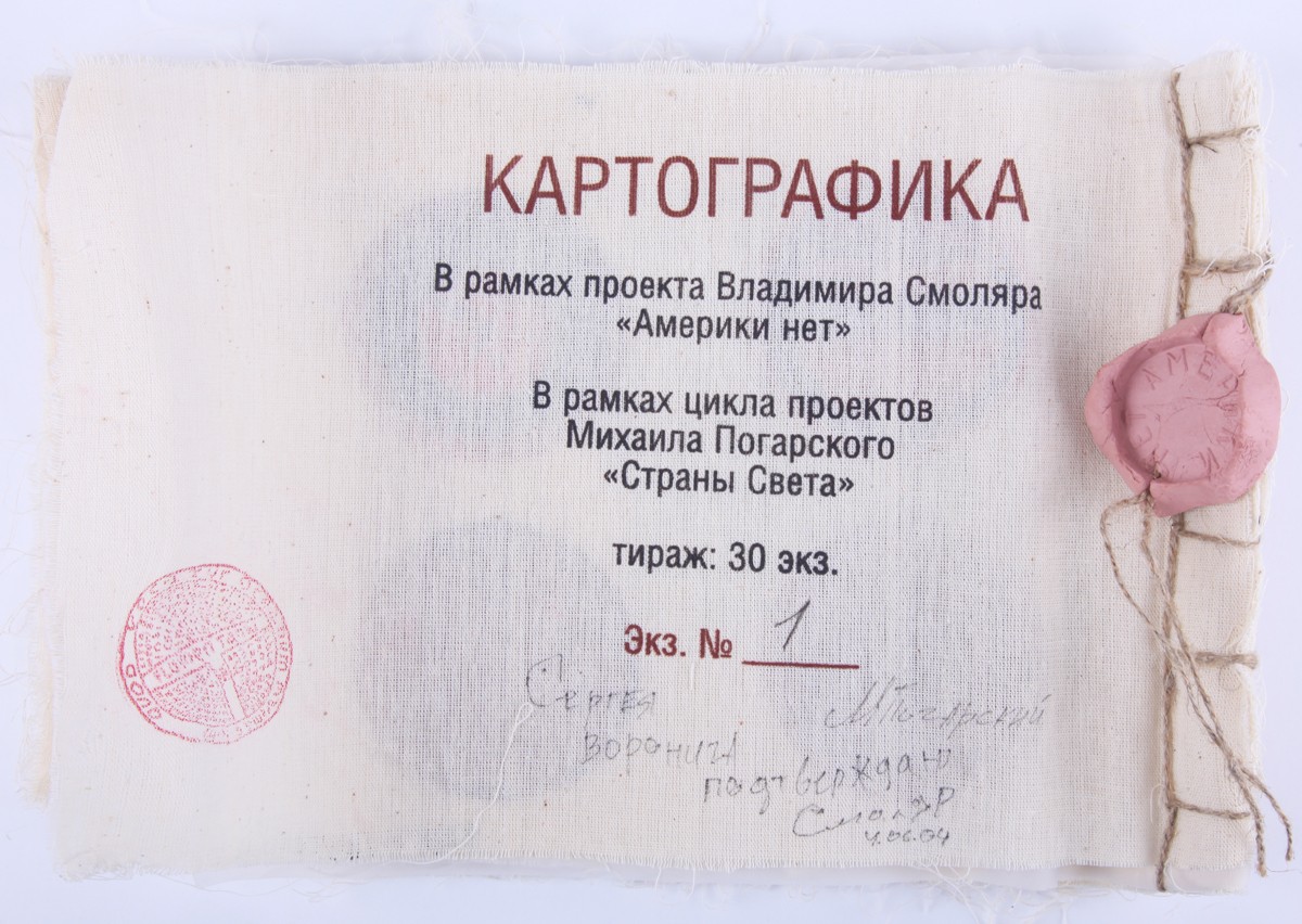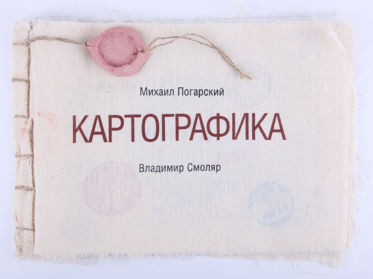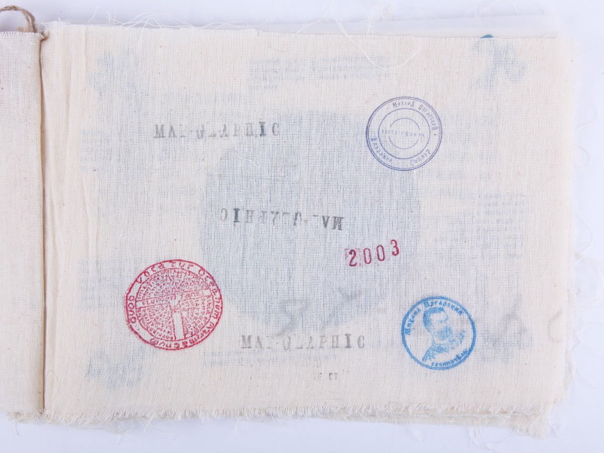 Ткань, калька, стекло, глина. Шелкография на ткани, штамп, пломбир, ручная роспись.Экз. №1, С. Воронича, с автографами авторов.