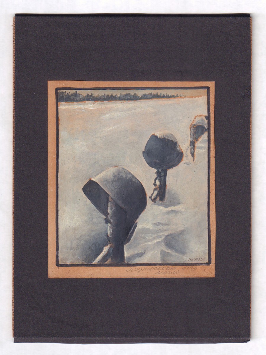 В правом нижнем углу работ: «Жека». Под работами — название и техника.