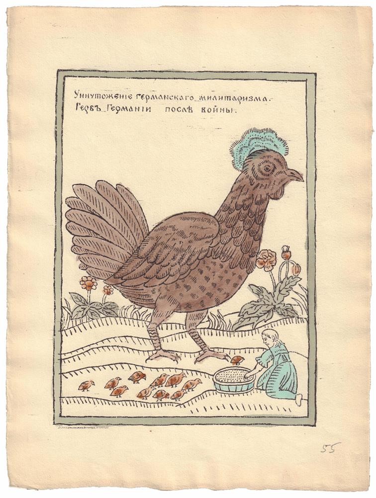 Антинемецкий лубок эпохи Первой мировой войны. Выпущен хромолитографией В. Шмигельского в Петрограде. Раскрашен вручную. На обороте штамп домашней библиотеки А.В. Улитина.