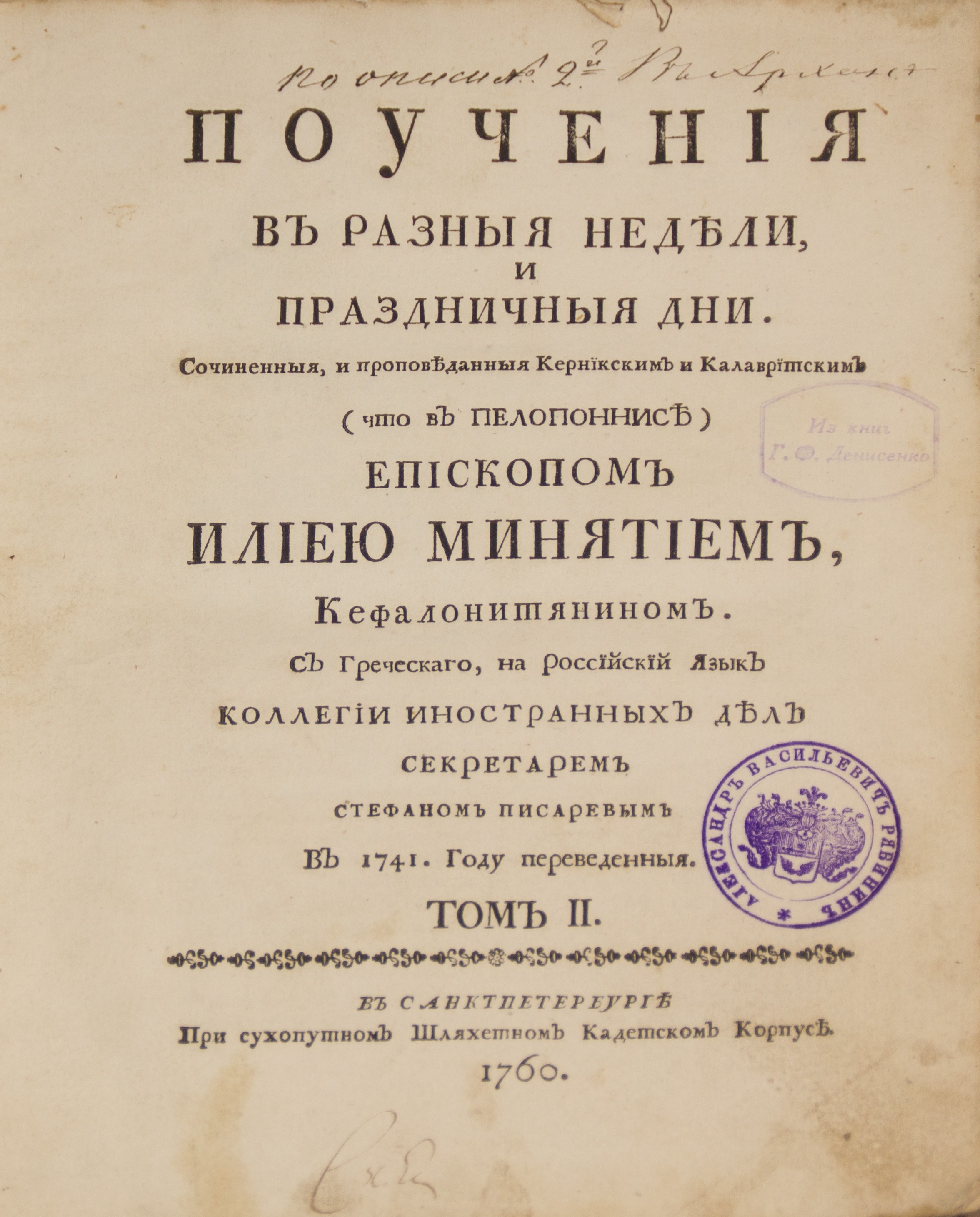 Владельческие надписи на обороте своб.л. форзаца, авантитуле и тит.л. Штемп. экслибрисы А.В.Рябинина и Г.Ф.Денисенко на тит.л.