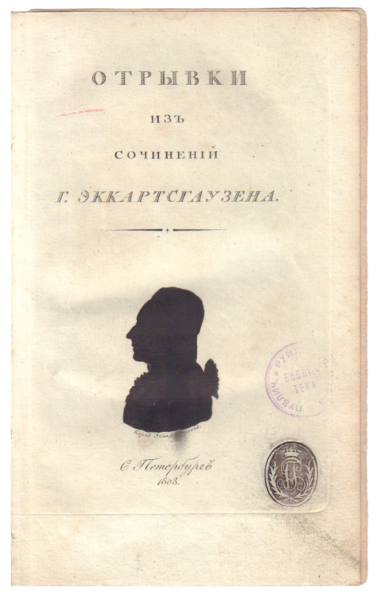 Фронтиспис и силуэт Карла Эккартсгаузена на титульном листе гравированы С. Галактионовым. Фрагменты иллюстрированной издательской обложки сохранены (вложены в книгу). Шт. экслибрис на тит. л.