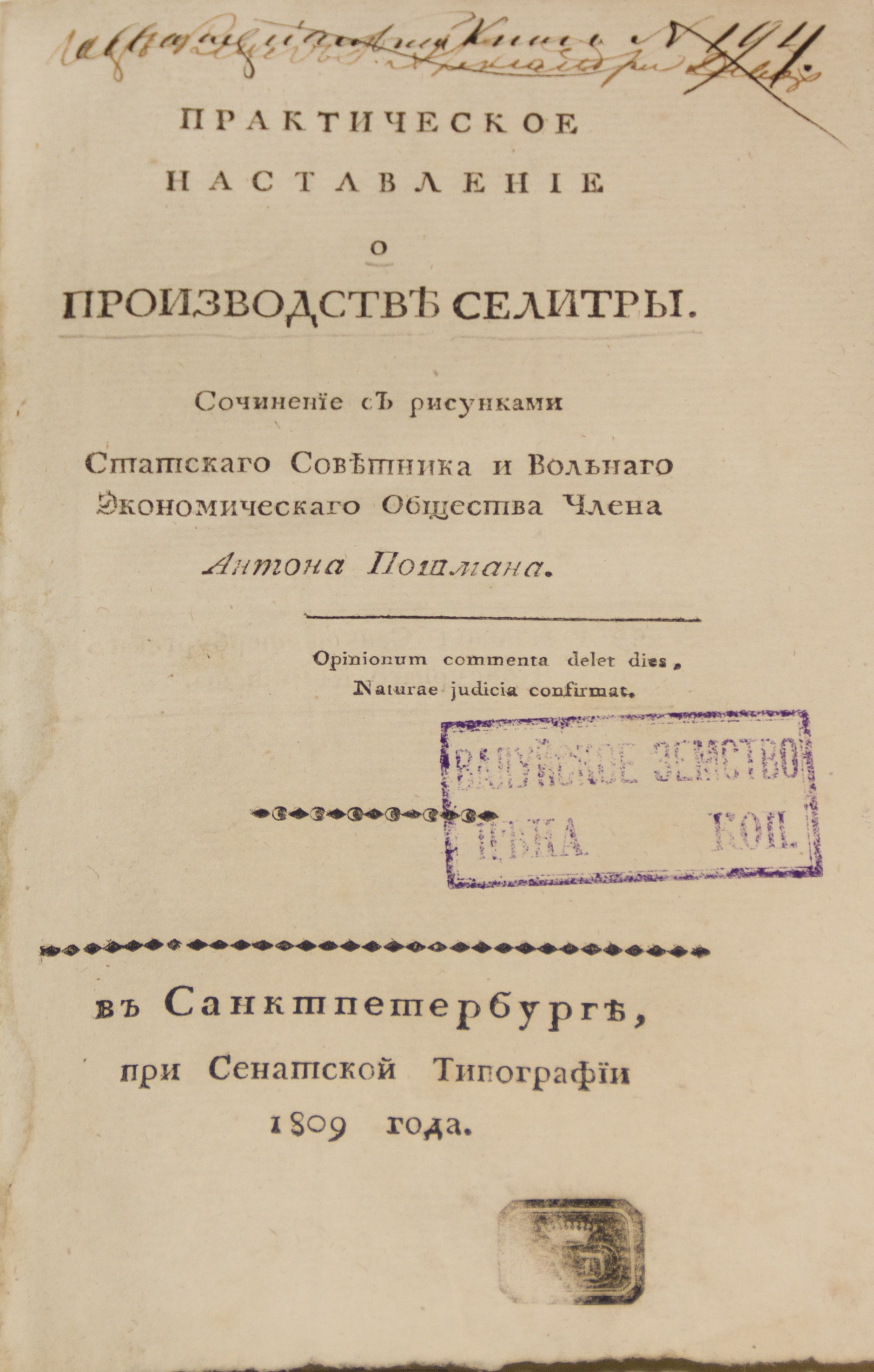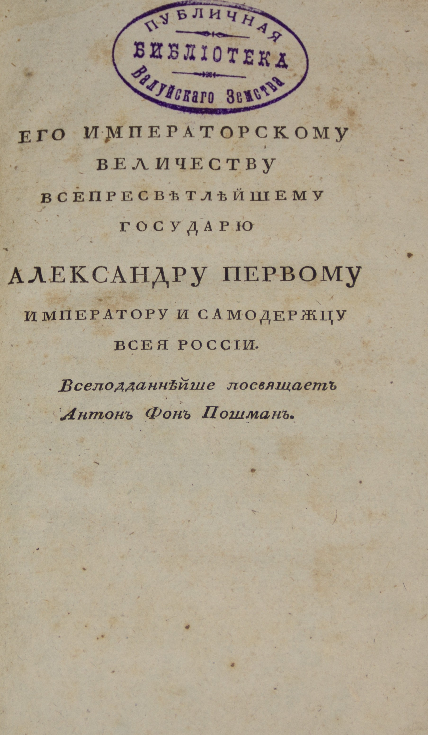 В полукожаном переплете эпохи с золотым тиснением на корешке. Штамп Валуйского земства, надписи орешковыми чернилами на тит.л. Штамп Публичной библиотеки Валуйского земства на стр. с посвящением Александру I. Складные листы чертежей.