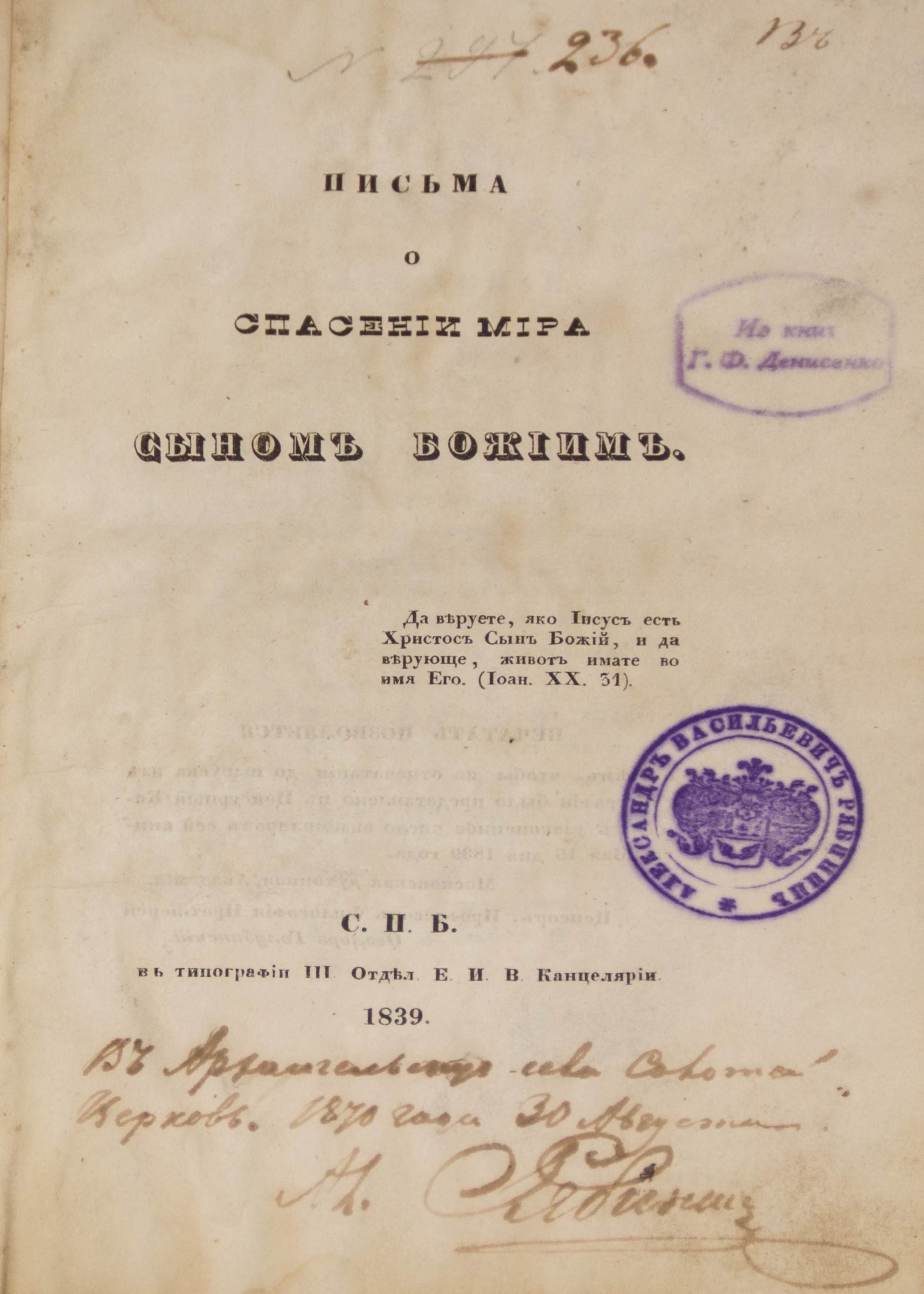 В полукожаном переплете эпохи.Штемп. экслибрисы А.В. Рябинина и Г.Ф. Денисенко на тит.л. и отдельных стр. Владельческие записи на тит.л. и стр. 170.