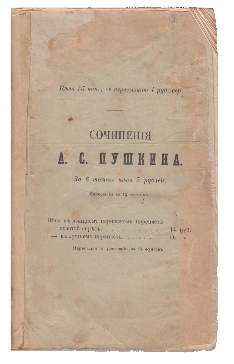 Утраты фрагментов обложки и корешка. Реставрация обложки и 4 ненум. с. «Лисьи» пятна.