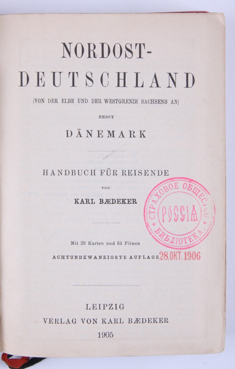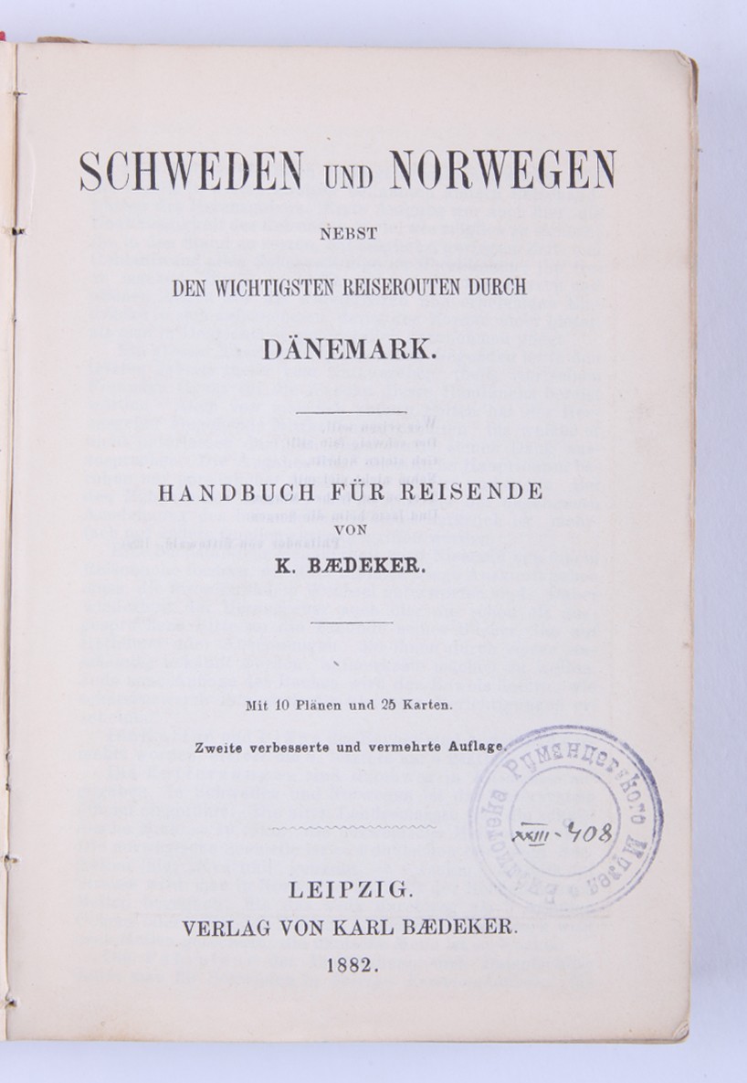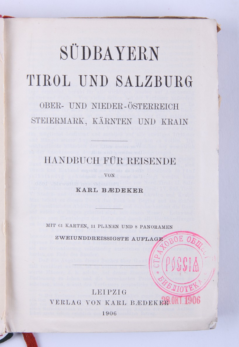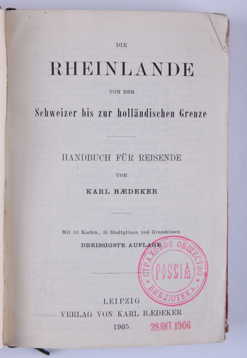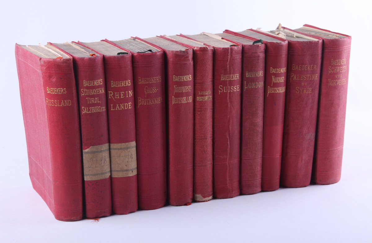1. [Россия, а также Тегеран, Порт-Артур, Пекин: руководство для путешественников]. Russland nebst Teheran, Port Arthur, Pekin: handbuch für Reisende / von Karl Baedeker. [Лейпциг: Карл Бедекер, 1912. - 570 с., ил., карт., план.; 16х10,6 см]. 2. [Австрия]. Oesterreich. Handbuch für Reisende / von Karl Baedeker. [Кобленц: Карл Бедекер, 1872. - 306 с., ил., карт., план.; 16х10,6 см]. 3. [Северо-Западная Германия]. Nordwest-Deutschland: Handbuch für Reisende / von Karl Baedeker. [Лейпциг: Карл Бедекер, 1908. - 428 с., ил., карт., план.; 16х10,6 см]. 4. [Швеция и Норвегия, а также маршруты через Данию]. Schweden und Norwegen nebst den wichtigsten reiserouten durch Dänemark: Handbuch für reisend / von Karl Baedeker. [Лейпциг: Карл Бедекер, 1882. - 422 с., 40 с. [разговорник], ил., карт., план.; 16х10,6 см]. 5. [Великобритания: Англия (кроме Лондона), Уэльс, Шотландия и Ирландия]. Grossbritannien: England (außer London), Wales, Schottland und Irland / von Karl Baedeker. [Лейпциг: Карл Бедекер, 1895. - 493 с., ил., карт., план.; 16х10,6 см]. 6. [Палестина и Сирия: Руководство для путешественника]. Palestine et Syrie: Manuel du voyageur / von Karl Baedeker. [Лейпциг: Карл Бедекер, 1882. - 463 с., ил., карт., план.; 16х10,6 см]. 7. [Лондон и окрестности]. London und Umgebung: Handbuch fuer Reisende / von Karl Baedeker. [Лейпциг: Карл Бедекер, 1905. - 382 с., ил., карт., план.; 16х10,6 см]. 8. [Швейцария и прилегающие к ней части Савойи и Италии]. La Suisse et les parties limitrophes de la Savoie et de l'Italie: manuel du voyageur / von Karl Baedeker. [Лейпциг: Карл Бедекер, 1907. - 572 с., ил., карт., план.; 16х10,6 см]. 9. [Северо-Восточная Германия: (от Эльбы и западной границы Саксонии) и Дания: руководство для путешественников]. Nordost-Deutschland : (von der Elbe und der Westgrenze Sachsens an) nebst Dänemark : Handbuch für Reisende / von Karl Baedeker. [Лейпциг: Карл Бедекер, 1905. - 464 с., ил., карт., план.; 16х10,6 см]. 10. [Южная Бавария, Тироль и Зальцбург: верхняя и Нижняя Австрия, Штирия, Каринтия и Крайн: руководство для путешественников]. Südbayern, Tirol und Salzburg : Ober- und Nieder-Öesterreich, Steiermark, Kärnten und Krain : Handbuch für Reisende / von Karl Baedeker. [Лейпциг: Карл Бедекер, 1906. - 648 с., ил., карт., план.; 16х10,6 см]. 11. [Рейнланд от швейцарской до голландской границы: руководство для путешественников]. Die Rheinlande von der Schweizer bis zur Holländischen Grenze : Handbuch für Reisende / von Karl Baedeker. [Лейпциг: Карл Бедекер, 1905. - 524 с., ил., карт., план.; 16х10,6 см].