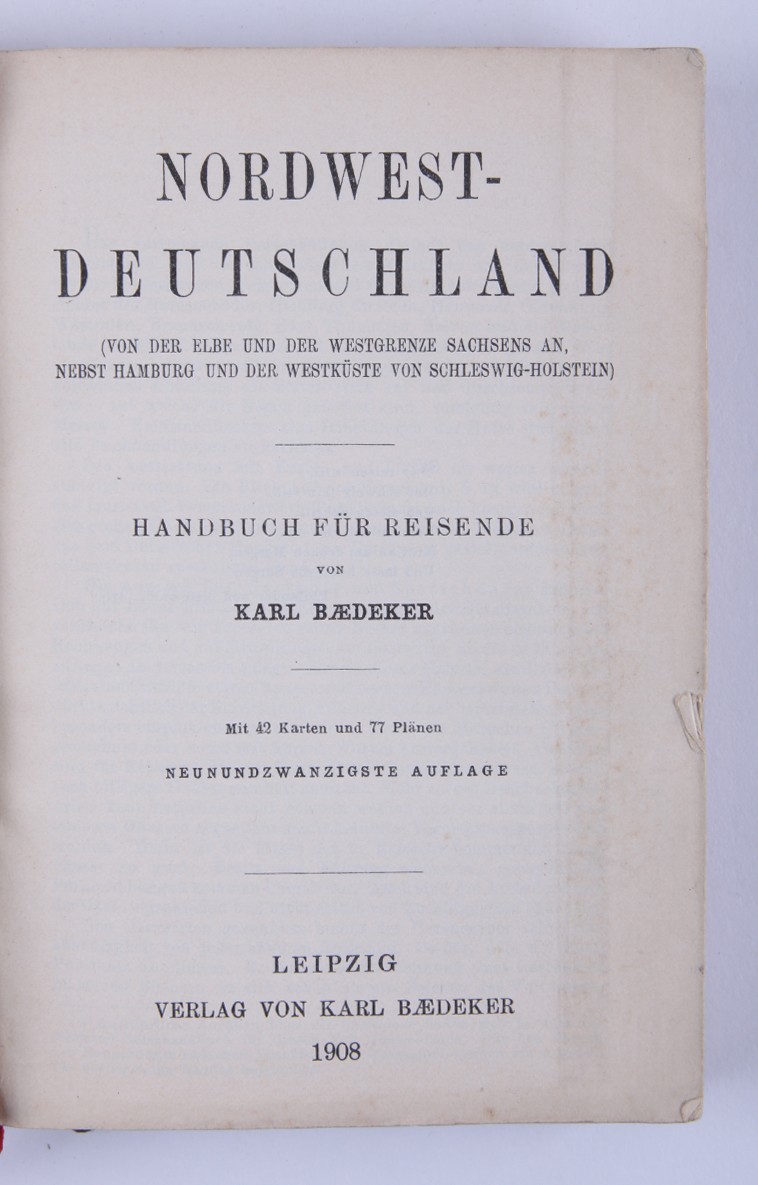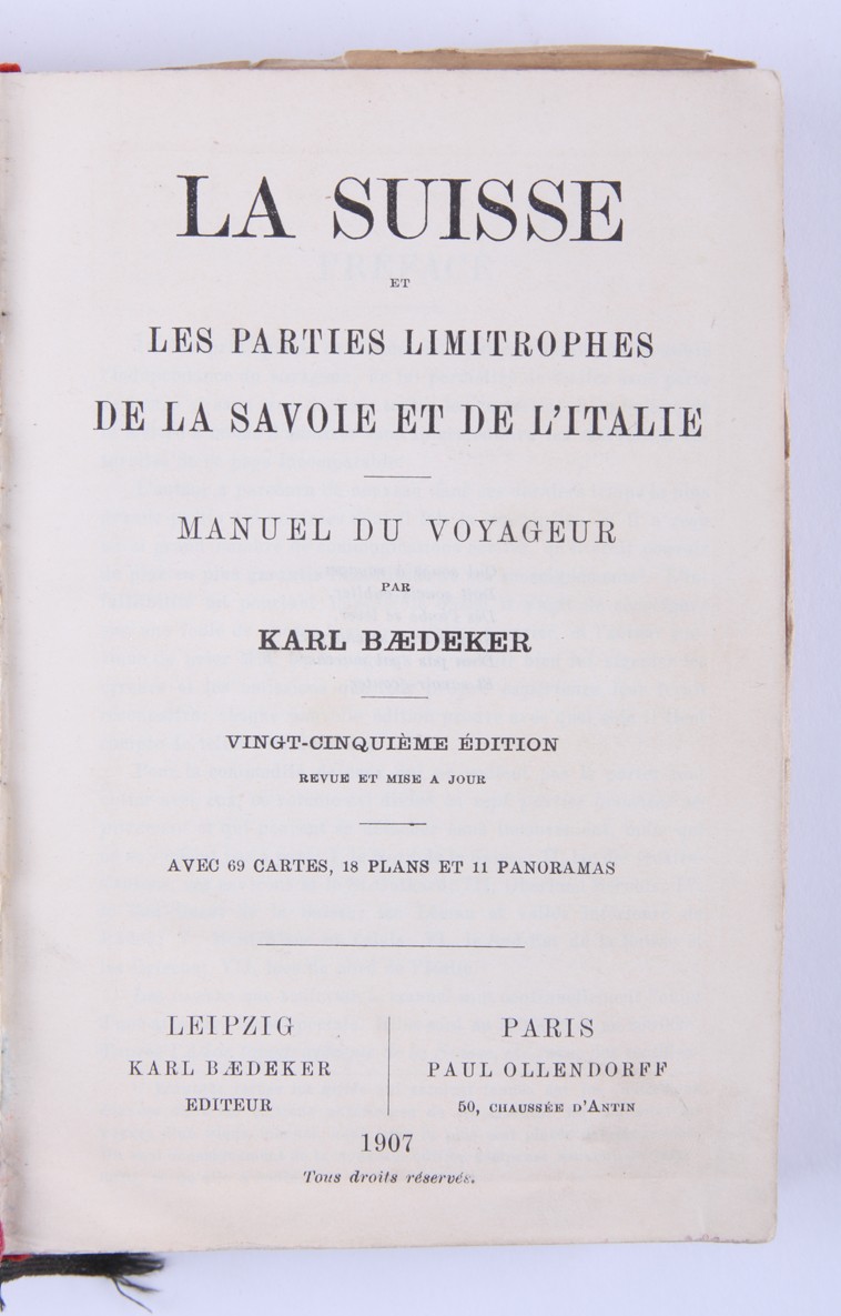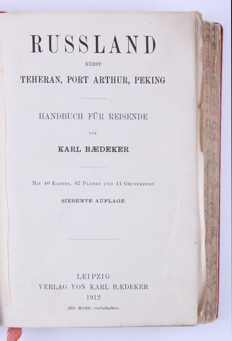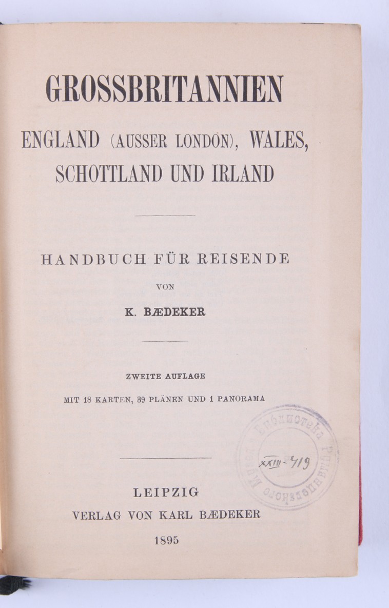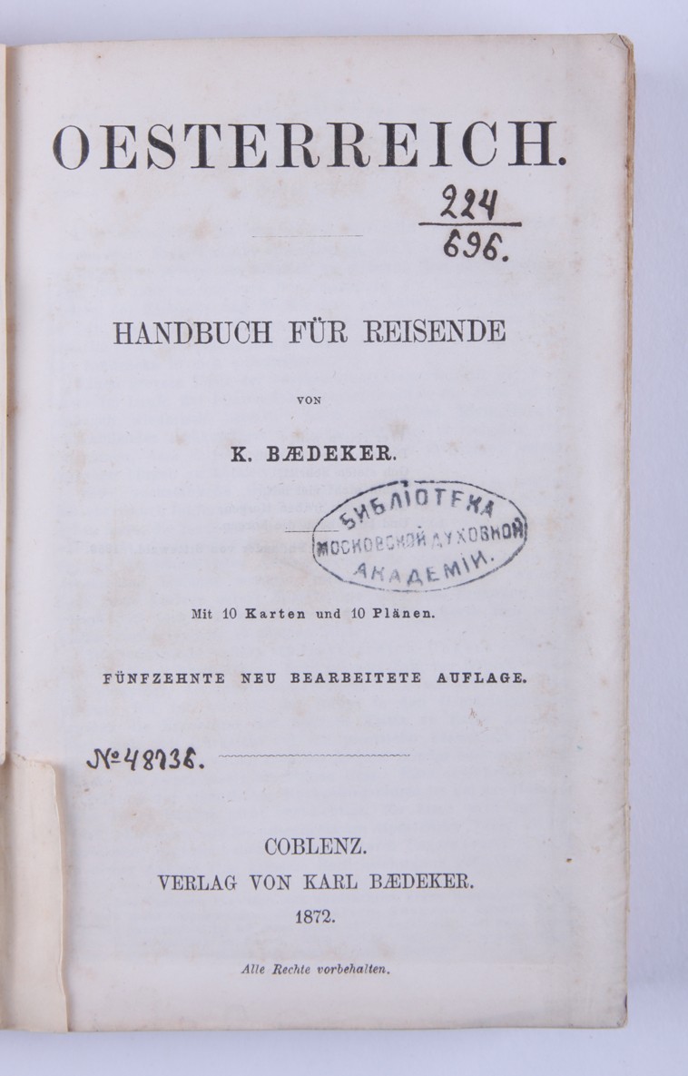 1. [Россия, а также Тегеран, Порт-Артур, Пекин: руководство для путешественников]. Russland nebst Teheran, Port Arthur, Pekin: handbuch für Reisende / von Karl Baedeker. [Лейпциг: Карл Бедекер, 1912. - 570 с., ил., карт., план.; 16х10,6 см]. 2. [Австрия]. Oesterreich. Handbuch für Reisende / von Karl Baedeker. [Кобленц: Карл Бедекер, 1872. - 306 с., ил., карт., план.; 16х10,6 см]. 3. [Северо-Западная Германия]. Nordwest-Deutschland: Handbuch für Reisende / von Karl Baedeker. [Лейпциг: Карл Бедекер, 1908. - 428 с., ил., карт., план.; 16х10,6 см]. 4. [Швеция и Норвегия, а также маршруты через Данию]. Schweden und Norwegen nebst den wichtigsten reiserouten durch Dänemark: Handbuch für reisend / von Karl Baedeker. [Лейпциг: Карл Бедекер, 1882. - 422 с., 40 с. [разговорник], ил., карт., план.; 16х10,6 см]. 5. [Великобритания: Англия (кроме Лондона), Уэльс, Шотландия и Ирландия]. Grossbritannien: England (außer London), Wales, Schottland und Irland / von Karl Baedeker. [Лейпциг: Карл Бедекер, 1895. - 493 с., ил., карт., план.; 16х10,6 см]. 6. [Палестина и Сирия: Руководство для путешественника]. Palestine et Syrie: Manuel du voyageur / von Karl Baedeker. [Лейпциг: Карл Бедекер, 1882. - 463 с., ил., карт., план.; 16х10,6 см]. 7. [Лондон и окрестности]. London und Umgebung: Handbuch fuer Reisende / von Karl Baedeker. [Лейпциг: Карл Бедекер, 1905. - 382 с., ил., карт., план.; 16х10,6 см]. 8. [Швейцария и прилегающие к ней части Савойи и Италии]. La Suisse et les parties limitrophes de la Savoie et de l'Italie: manuel du voyageur / von Karl Baedeker. [Лейпциг: Карл Бедекер, 1907. - 572 с., ил., карт., план.; 16х10,6 см]. 9. [Северо-Восточная Германия: (от Эльбы и западной границы Саксонии) и Дания: руководство для путешественников]. Nordost-Deutschland : (von der Elbe und der Westgrenze Sachsens an) nebst Dänemark : Handbuch für Reisende / von Karl Baedeker. [Лейпциг: Карл Бедекер, 1905. - 464 с., ил., карт., план.; 16х10,6 см]. 10. [Южная Бавария, Тироль и Зальцбург: верхняя и Нижняя Австрия, Штирия, Каринтия и Крайн: руководство для путешественников]. Südbayern, Tirol und Salzburg : Ober- und Nieder-Öesterreich, Steiermark, Kärnten und Krain : Handbuch für Reisende / von Karl Baedeker. [Лейпциг: Карл Бедекер, 1906. - 648 с., ил., карт., план.; 16х10,6 см]. 11. [Рейнланд от швейцарской до голландской границы: руководство для путешественников]. Die Rheinlande von der Schweizer bis zur Holländischen Grenze : Handbuch für Reisende / von Karl Baedeker. [Лейпциг: Карл Бедекер, 1905. - 524 с., ил., карт., план.; 16х10,6 см].
