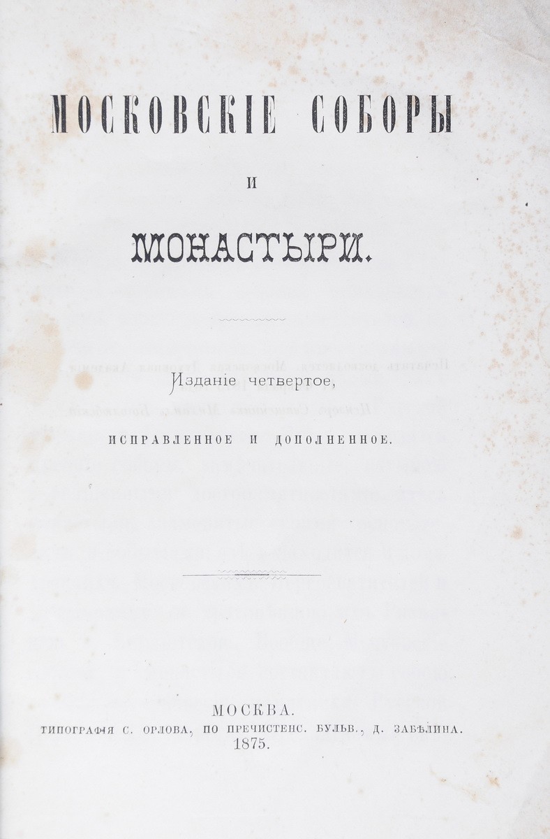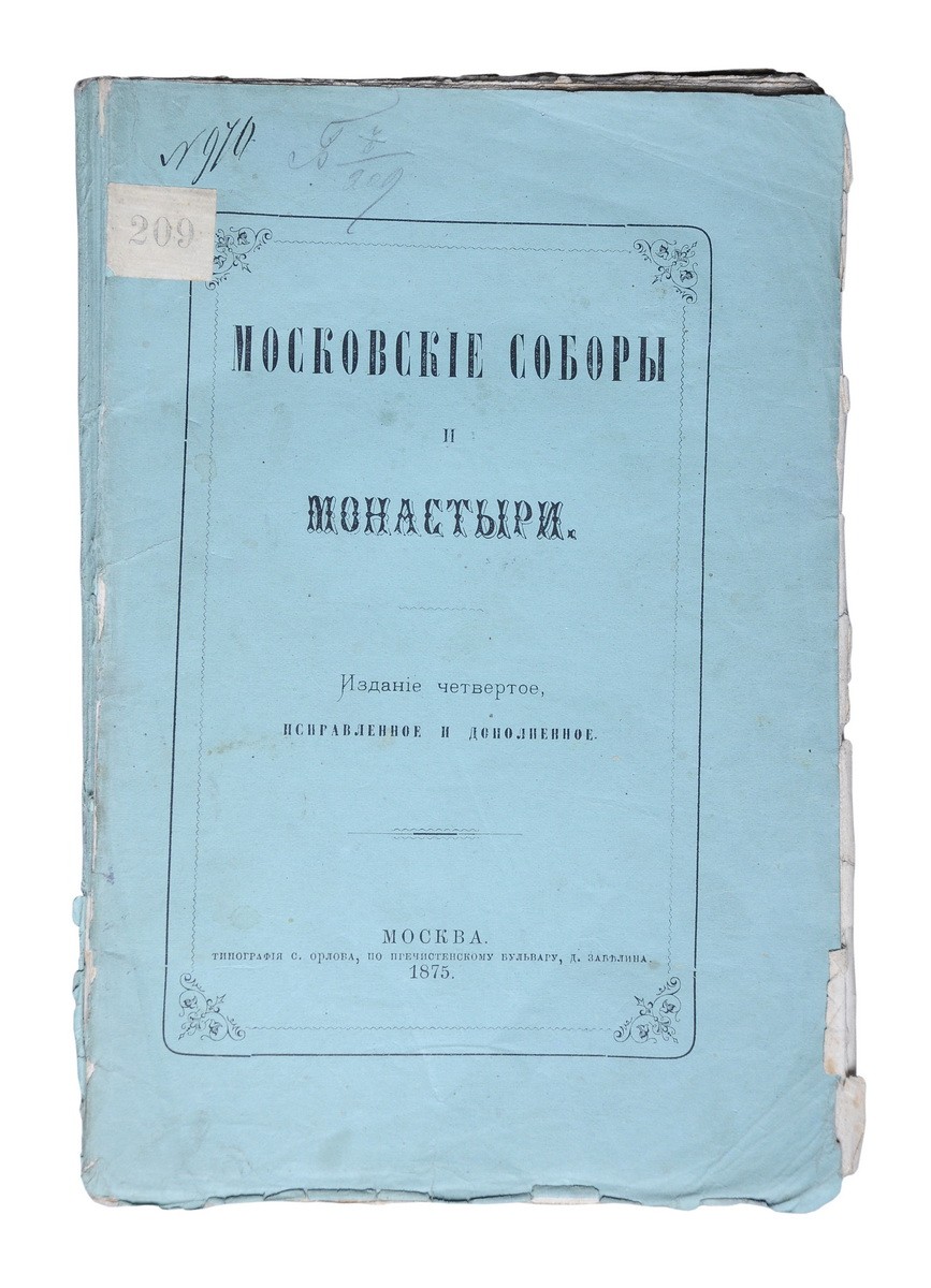 Авт. указан в конце текста. В двухцветной орнаментированной издательской обложке. Надрыв и утрата фрагмента корешка, влад. ярлык на 1 с. обложки. К с. 22 приклеена вырезка из «Правительственного вестника», посвященная возобновлению иконостасов в московском Даниловом монастыре.