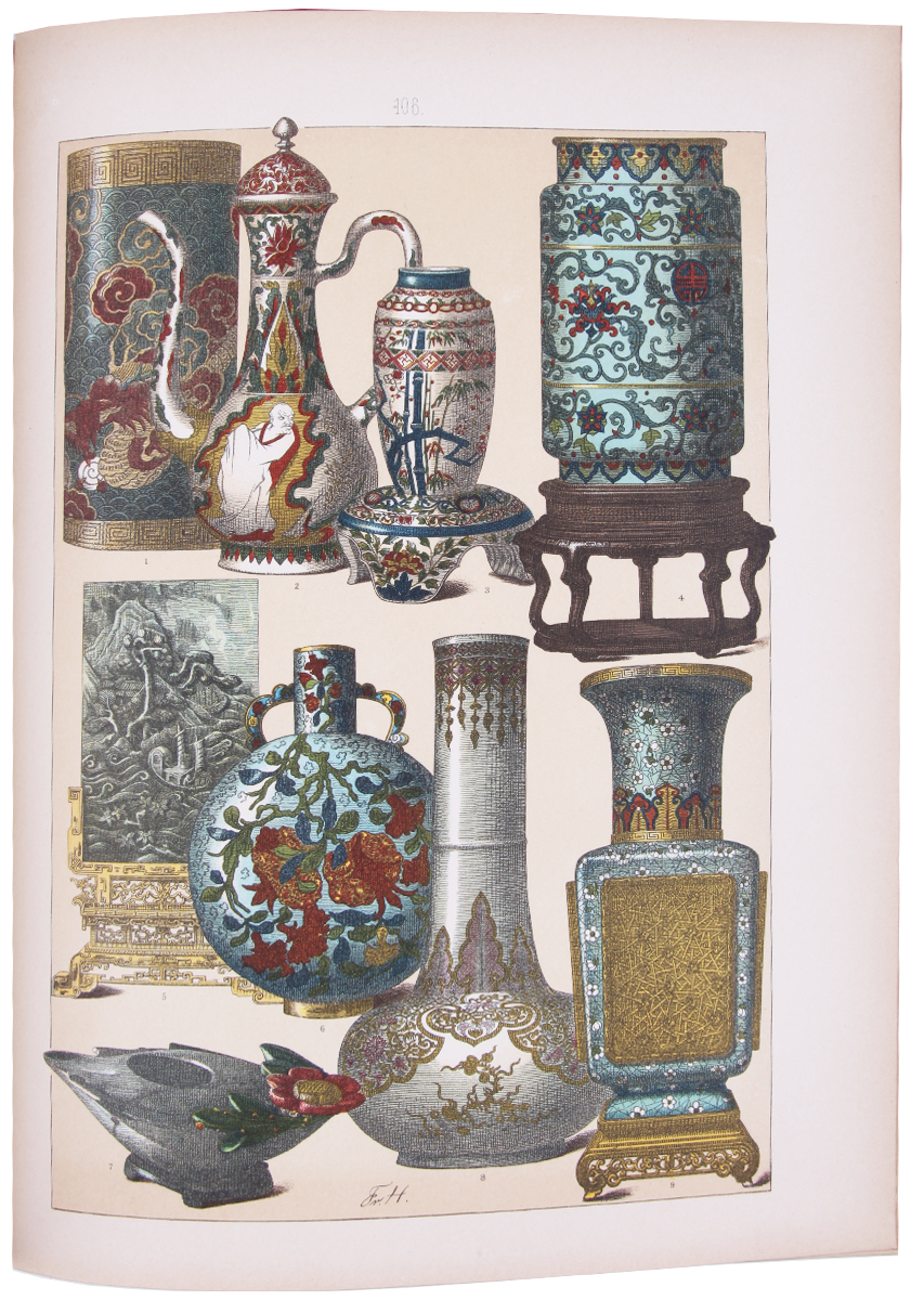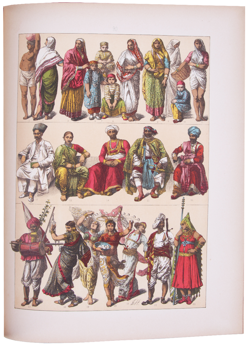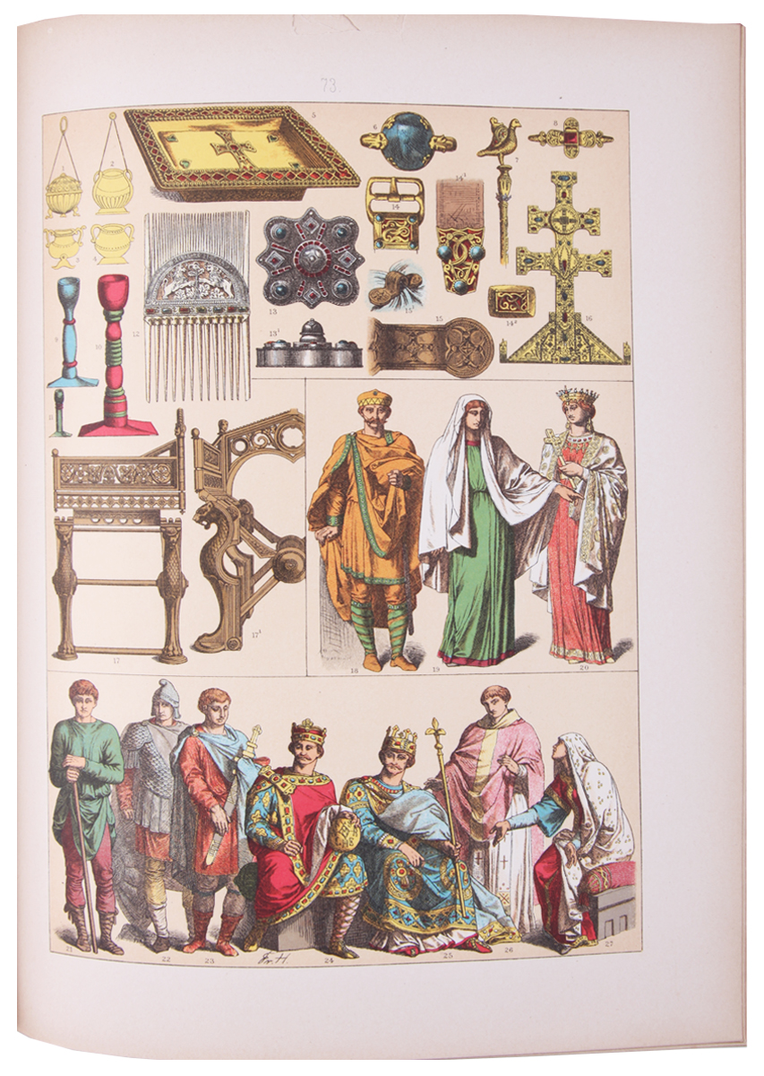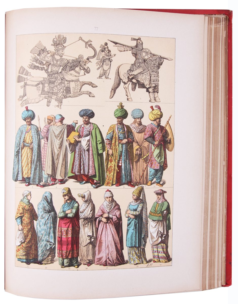 240 листов многофигурных таблиц, где изображены костюмы различных народов, сословий (внутри сословий имеется разделение на женские, мужские и детские), отдельно представлена бытовая утварь (инструменты, посуда, мебель, предметы культа), военные облачения, боевые машины и оружие; многочисленные иллюстрации в тексте. В роскошном коленкоровом издательском переплете с полихромным тиснением по передним крышкам и корешкам. Тройной золотой обрез.