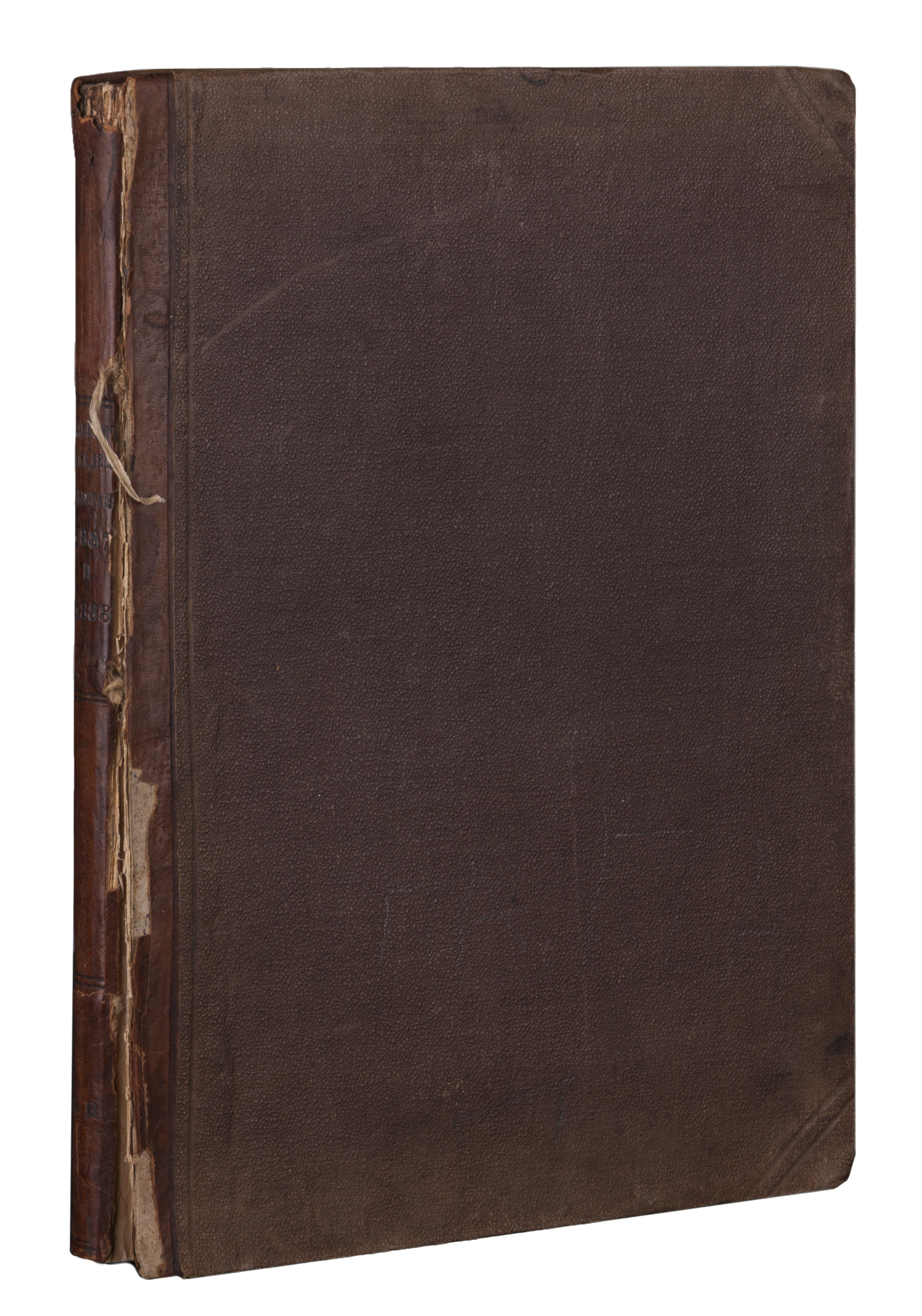 Верхняя переплетная крышка отходит от блока. Утрата фрагментов своб. л. форзаца. Бледные разводы. «Лисьи» пятна.