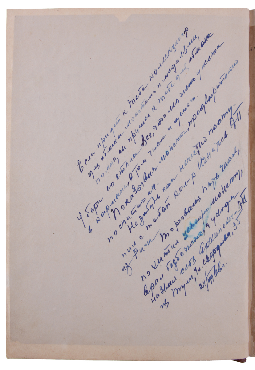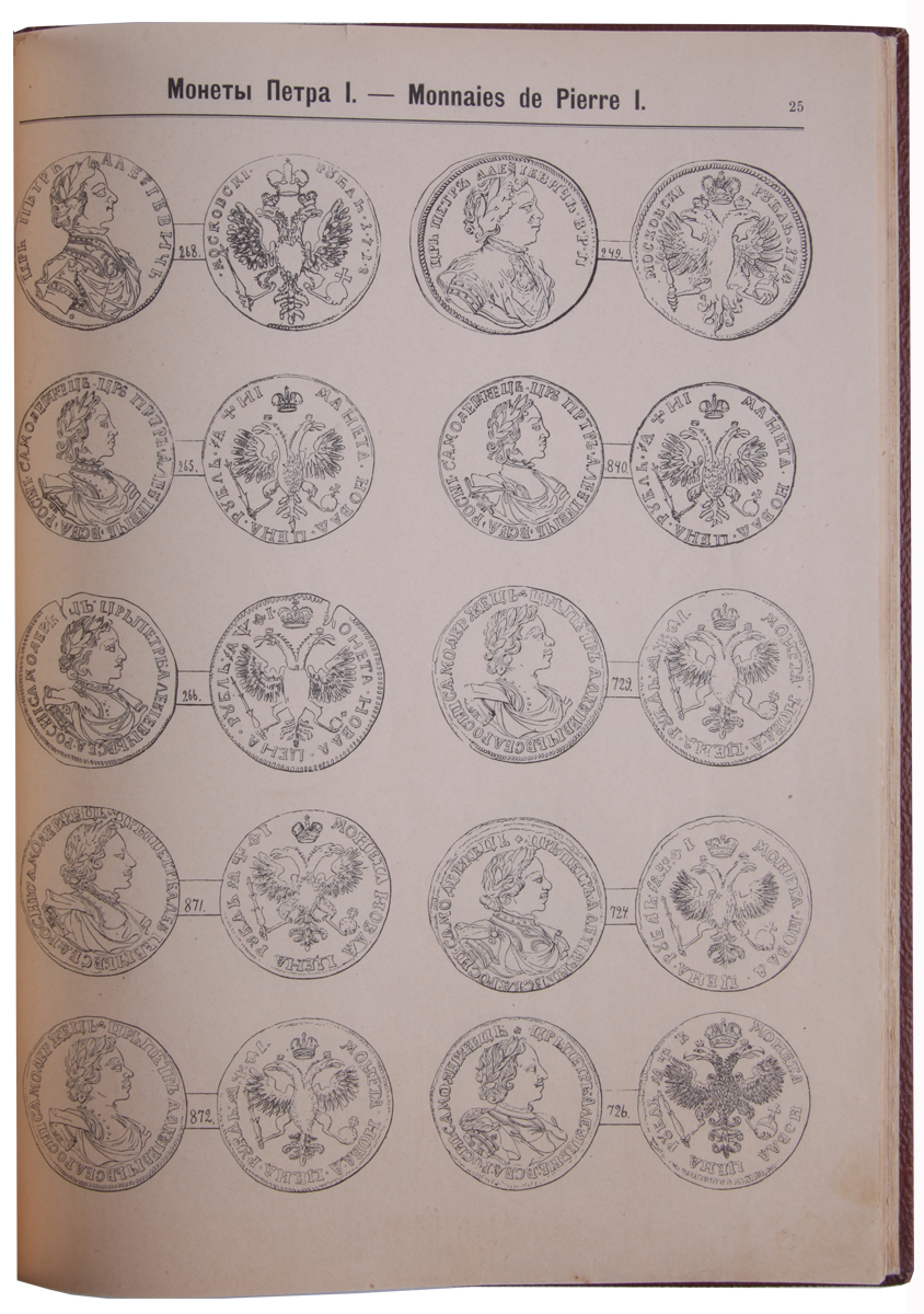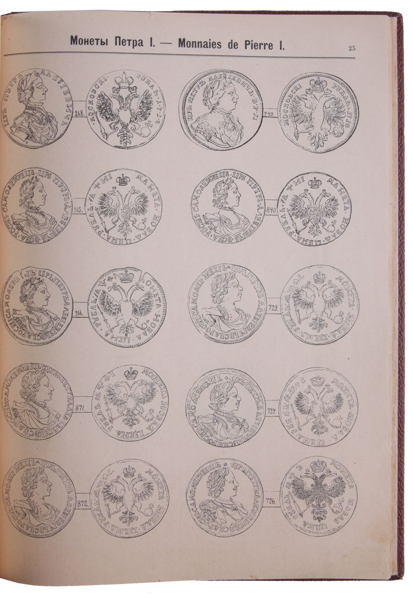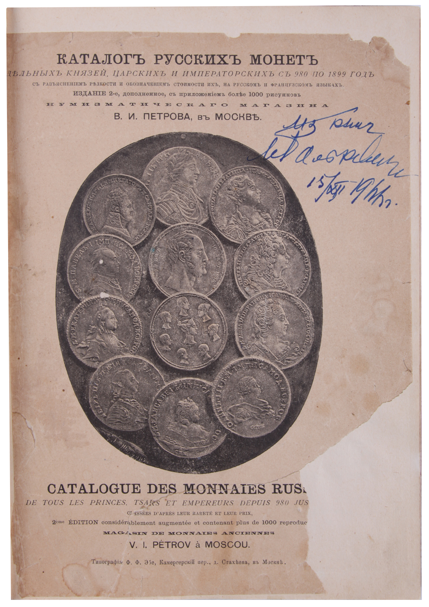 Владельческая дарственная надпись-напутствие на обороте верхней сторонки обложки: «Если придет к тебе коллекционер / для обмена монетами и медалями, / помни, он пришел к тебе для обмана. / Убери со стола все, что можно унести / в кармане, в том числе и деньги. / Показывая монеты, предварительно / посчитай их. / Не забудь как нечестно посту- / пил с тобой кол-р Игнатьев АП / из Риги / Торговался пять часов, / похитил ценную монету, / врал безбожно, а уходя / назвал себя Архиповым АП / из Тулы, ул. Свердлова, 35 / 24XII66г.». Фрагменты иллюстрированной издательской обложки продублированы на бумагу и сохранены в переплете. В коленкоровом переплете сер. ХХ в. Влад. надпись на тит. л.