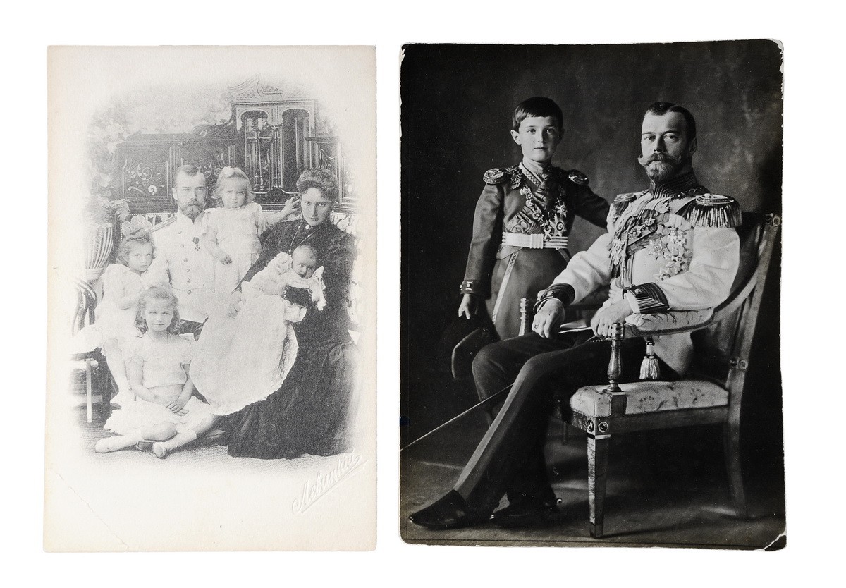 13,8х10,2; 14х9 см. Фотографии «Император Николай II с цесаревичем Алексеем» и «Император Николай II с супругой и дочерьми» (последняя — работы С.Л. Левицкого). Следы клея и владельческие пометы на обороте фотографии.