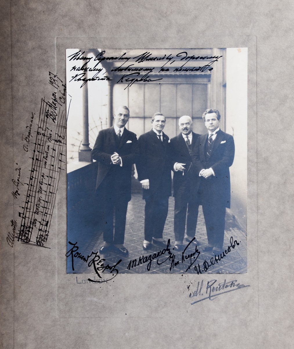 Коллекционная сохранность. Дарственная надпись Н.Н. Кедрова по верхнему полю фото: «Ивану Сергеевичу Шмелеву, дорогому / нашему, любимому на память о / Квартете Кедрова». По нижнему полю — подписи вокалистов. На левом поле паспарту нотная запись фрагмента серенады А. Бородина «Все четверо, четверо любим мы Вас!», а также авторская датировка и обозначение места: «28 марта 1927. / Севр». Николай Николаевич Кедров (1871-1940) — русский оперный и камерный певец (баритон), православный композитор и музыкальный педагог, создатель мужского квартета Кедрова.
