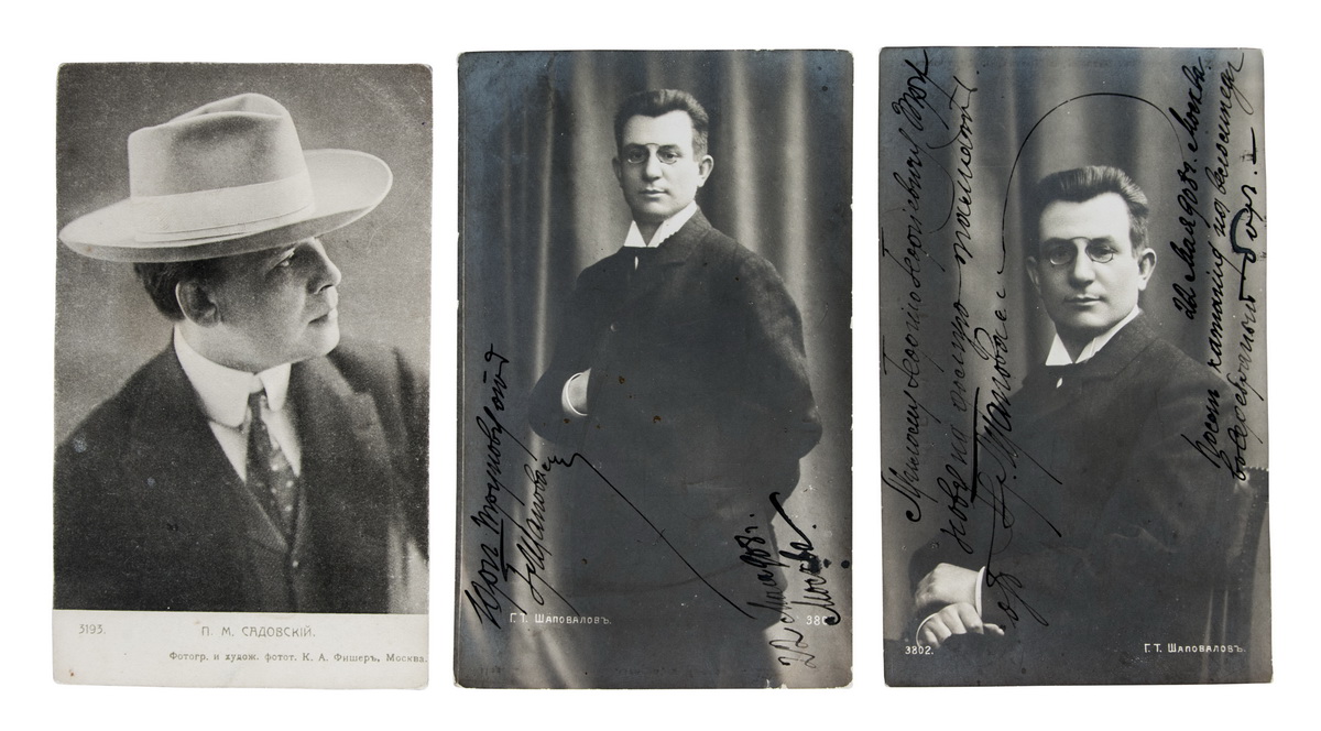 1. Две фотографические открытки с изображением актера Г.Т. Шаповалова. Начало ХХ века. 14,1х8,7 см. 2. Фотографическая открытка с изображением актера П.М. Садовского. Первая четверть ХХ века. 13,9х8,5 см.