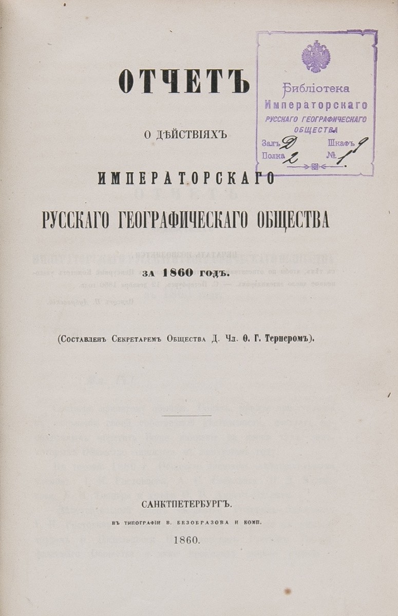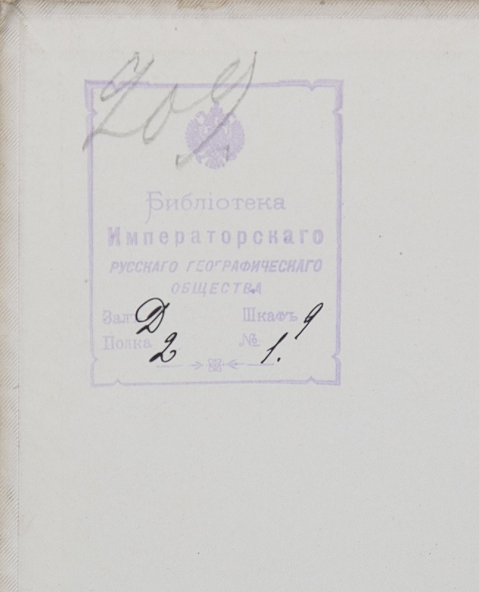 Во владельческом "муаровом" коленкоровом переплете. Очень хорошая сохранность. Штемп. экслибрис библиотеки РГО на форзаце и тит.л.