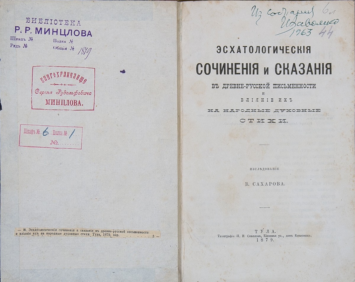 В полукожаном переплете эпохи. На форзаце шт.: «Библиотеки Р.Р. Минцлова» и «Книгохранилища Сергея Рудольфовича Минцлова».