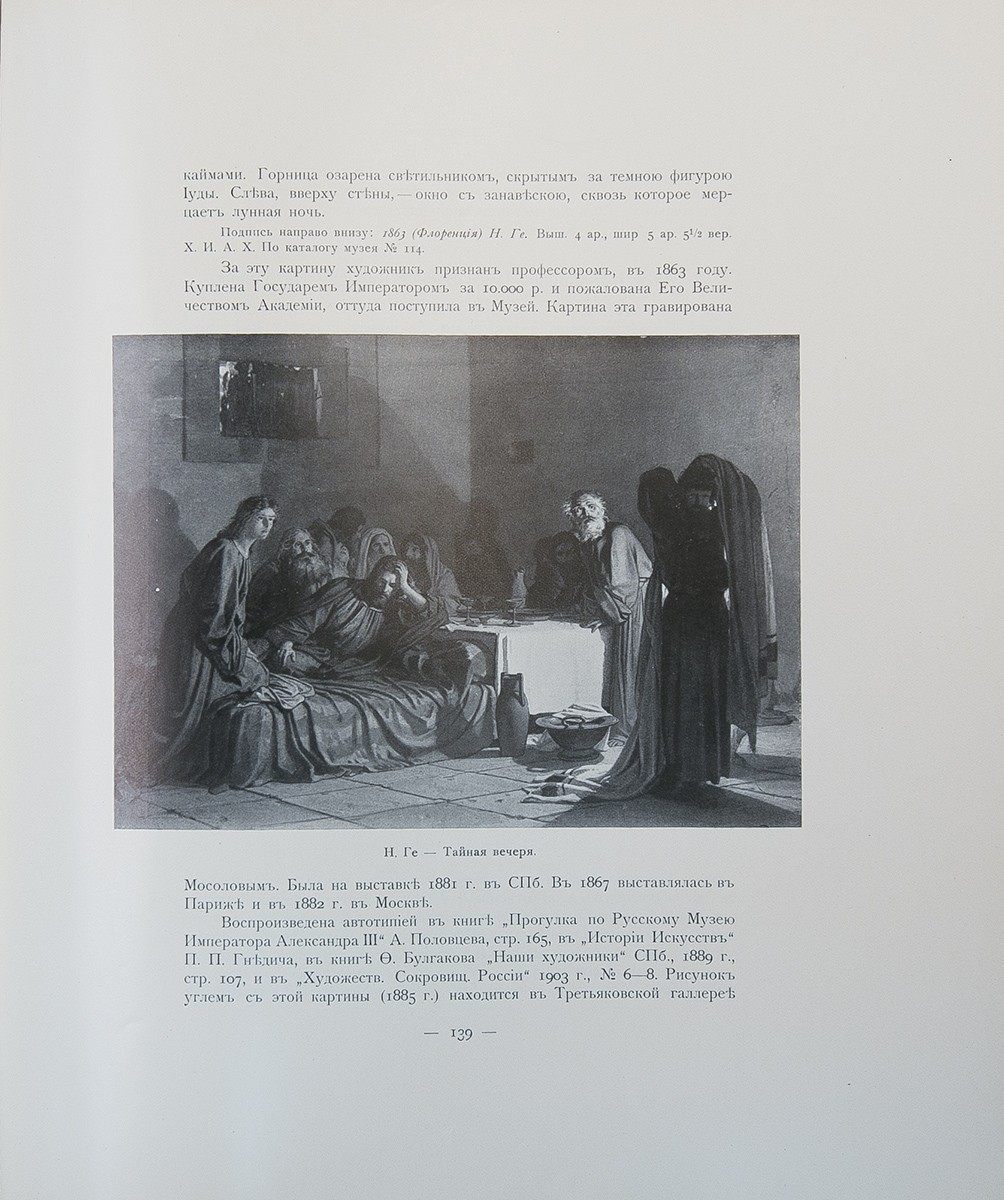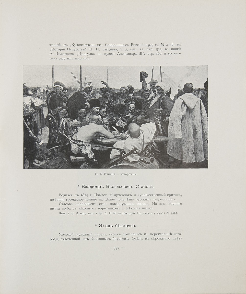 Один из первых каталогов коллекции Русского музея в начале ее формирования, иллюстрированный снимками с лучших работ знаменитых русских художников. В издании в алфавитном порядке представлены краткие биографии художников и скульпторов и описания их работ, исторические справки о происхождении этих произведений искусства.