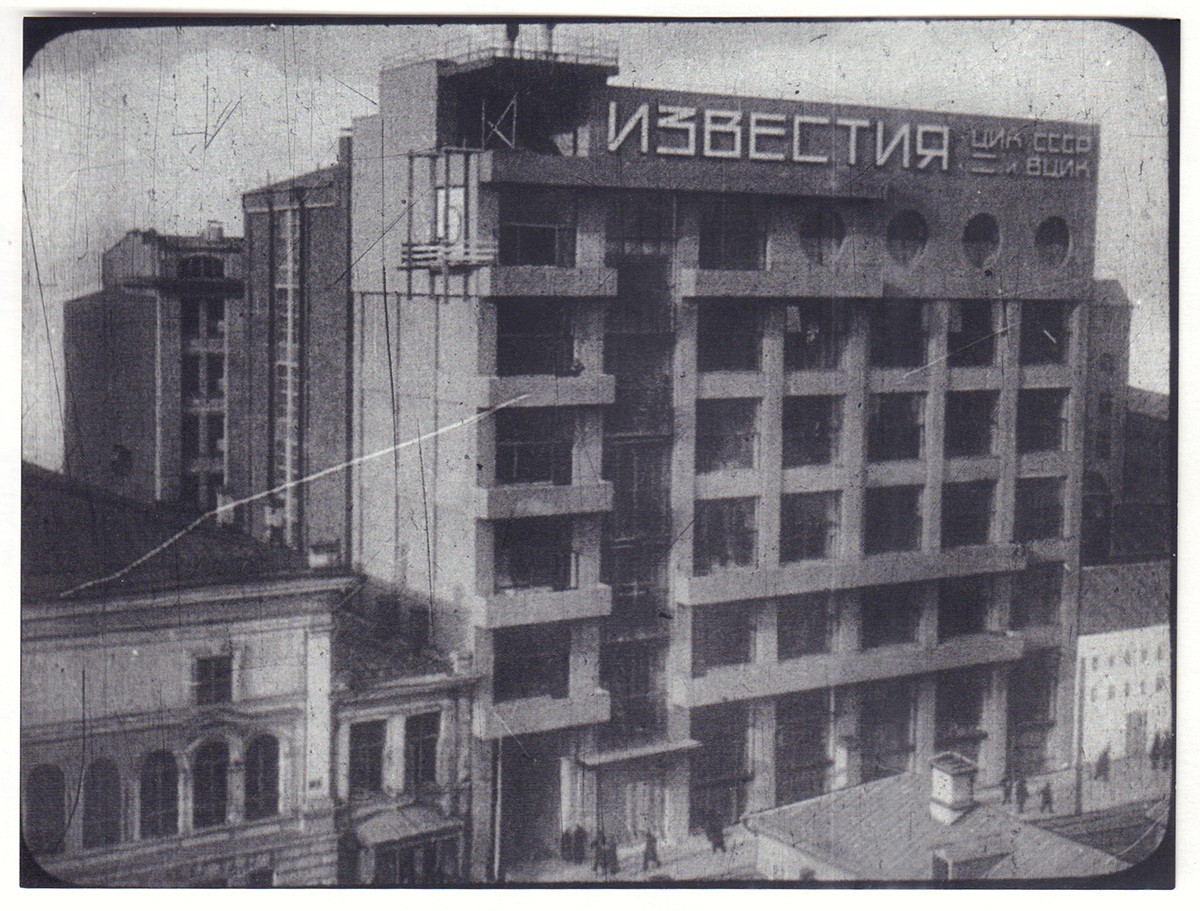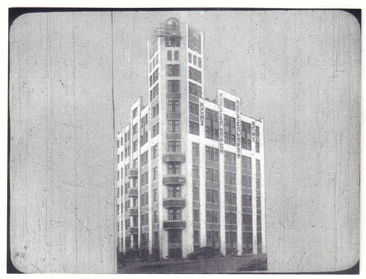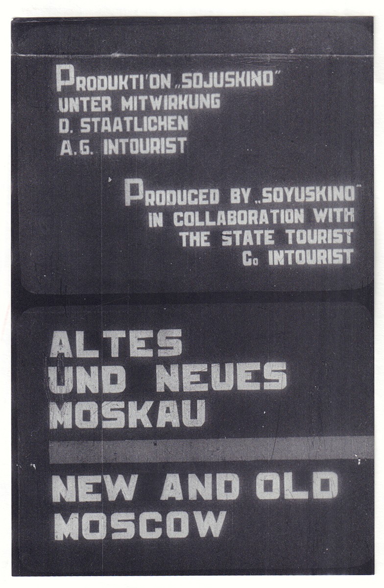 Диафильм с видами исторических достопримечательностей Москвы и конструктивистских зданий с подписями на английском и немецком языках.