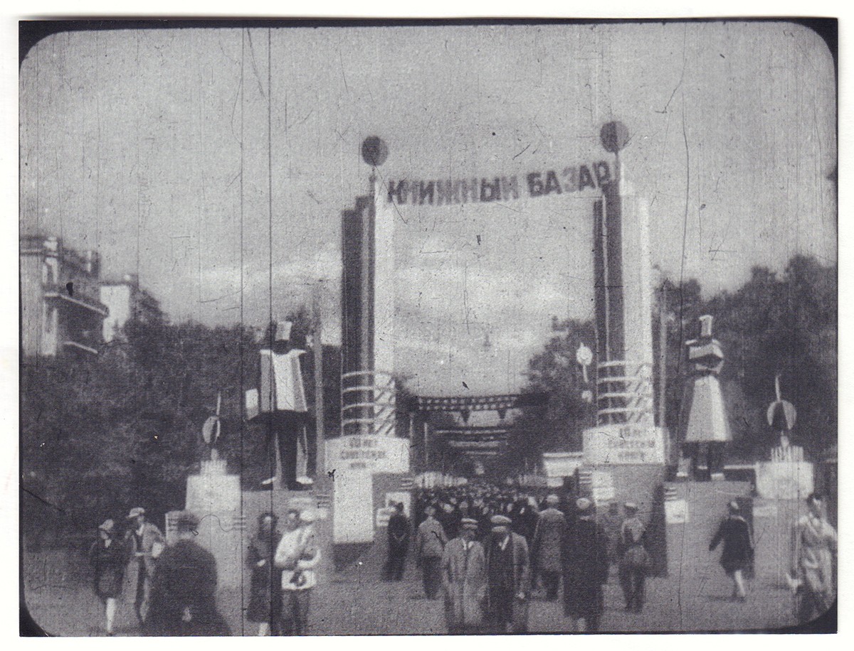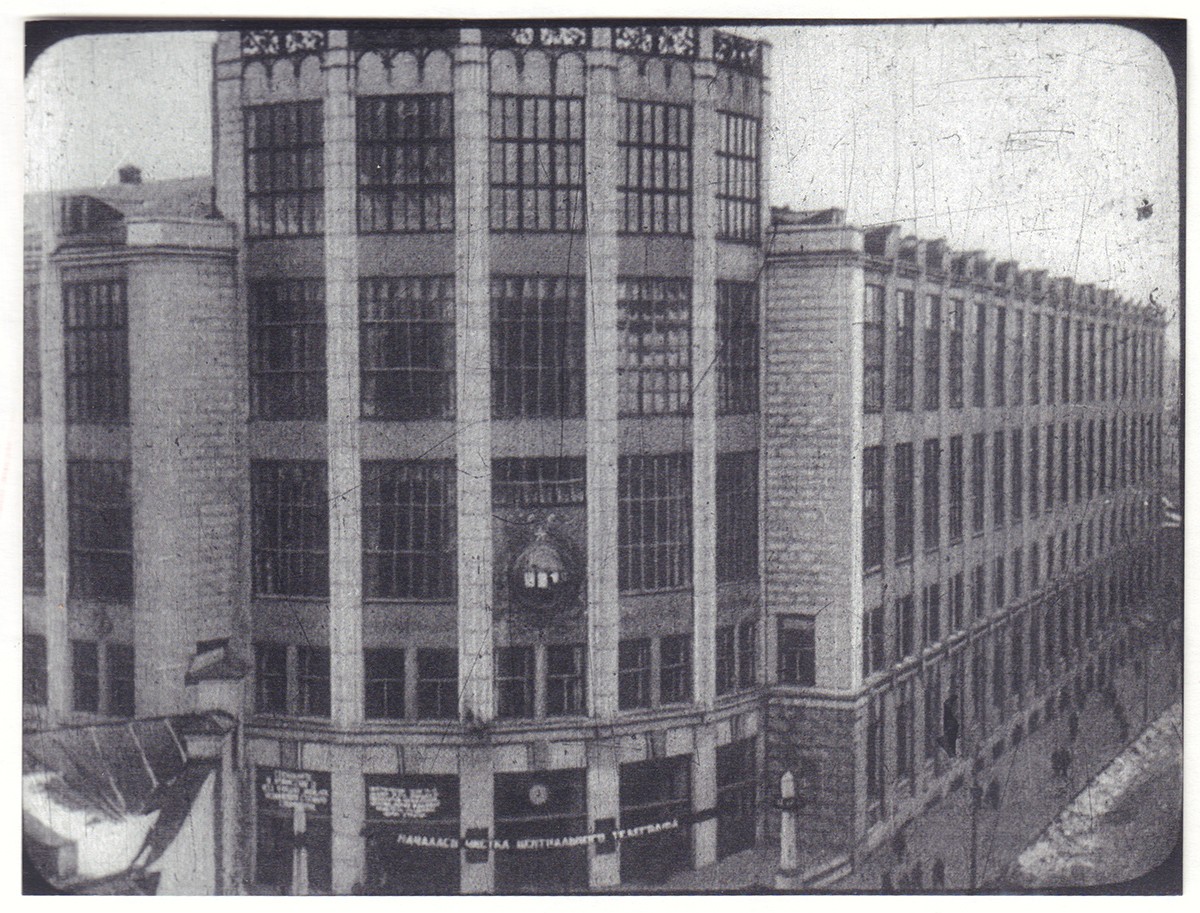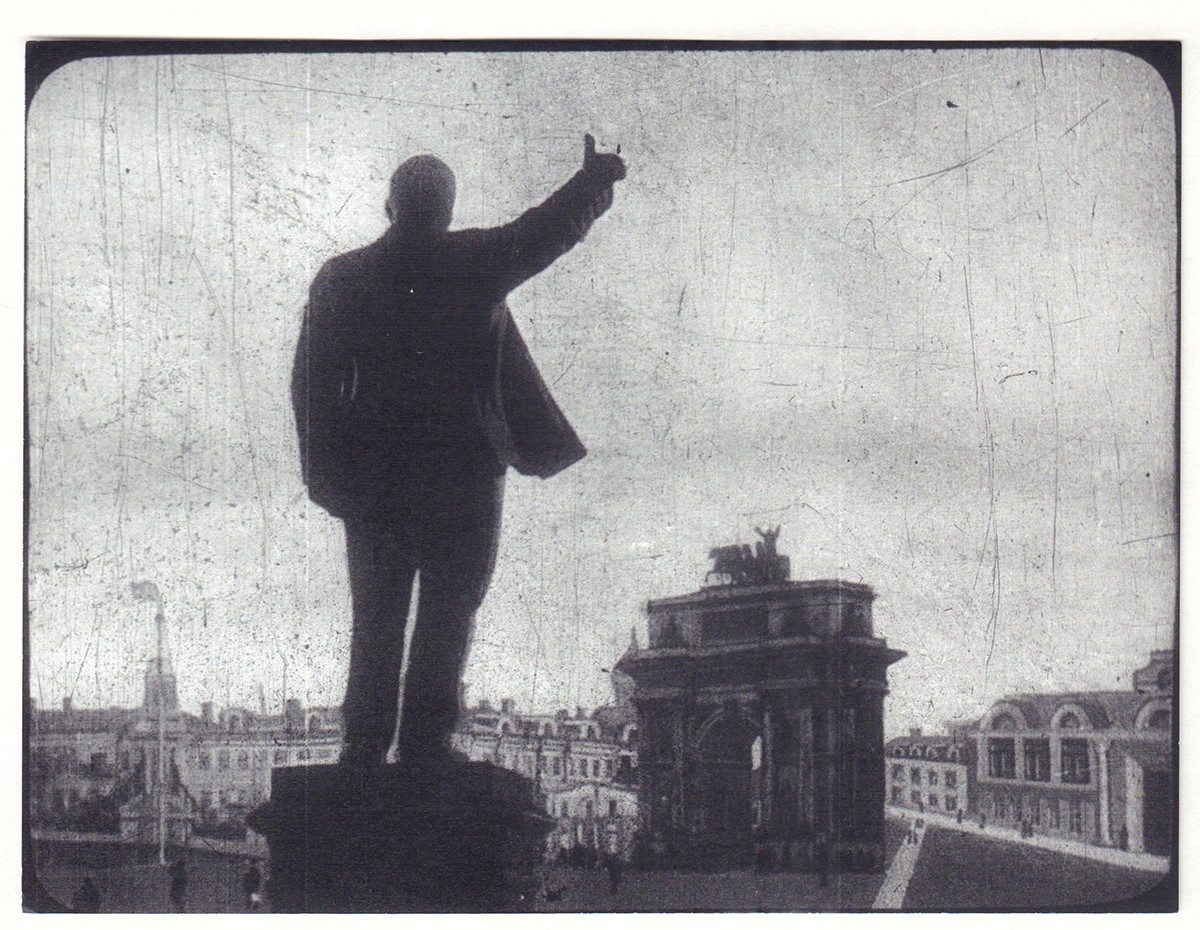 Диафильм с видами исторических достопримечательностей Москвы и конструктивистских зданий с подписями на английском и немецком языках.