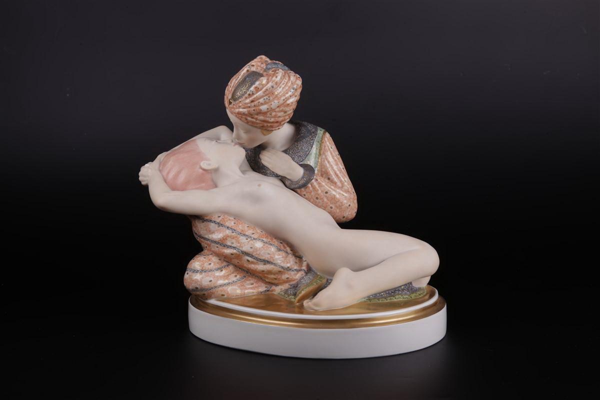 Фарфор, надглазурная роспись, золочение. Марка: синяя подглазурная «три волны», зеленая «ROYAL COPENHAGEN» вокруг короны, ниже — «Denmark», в тесте «1664» — номер модели скульптора. Высота — 22 см.