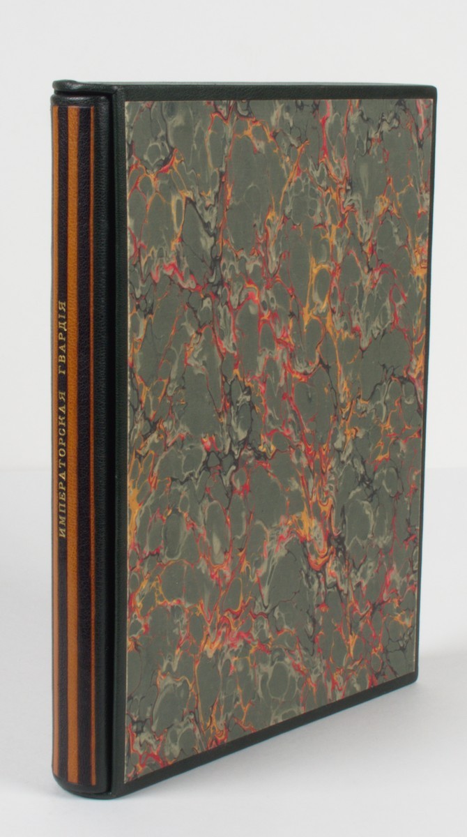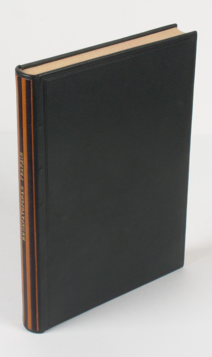 В современном цельнокожаном переплете, вдоль по корешку — кожаная мозаика в виде ленты Ордена Святого Георгия. В современном кожаном футляре. Форзац и нахзац из мраморной бумаги (“павлинье перо”). Издательские обложки сохранены под переплетом.
