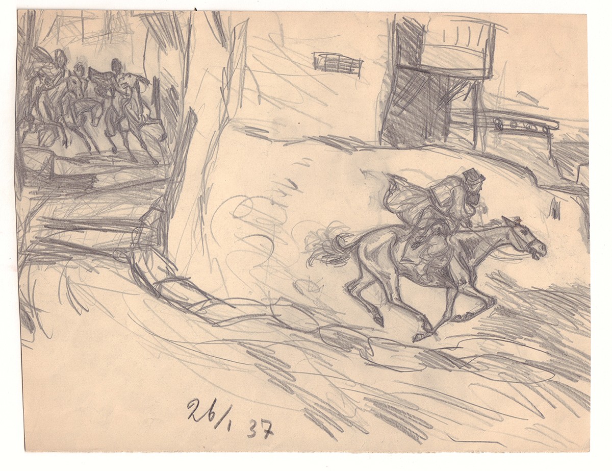 1. Жанровая сцена с всадниками. - 1940-е. Бумага, карандаш. - 22х28 см; 2. Жанровая сцена с красноармейцами. - 1940-е. Бумага, карандаш. - 23х22 см.
