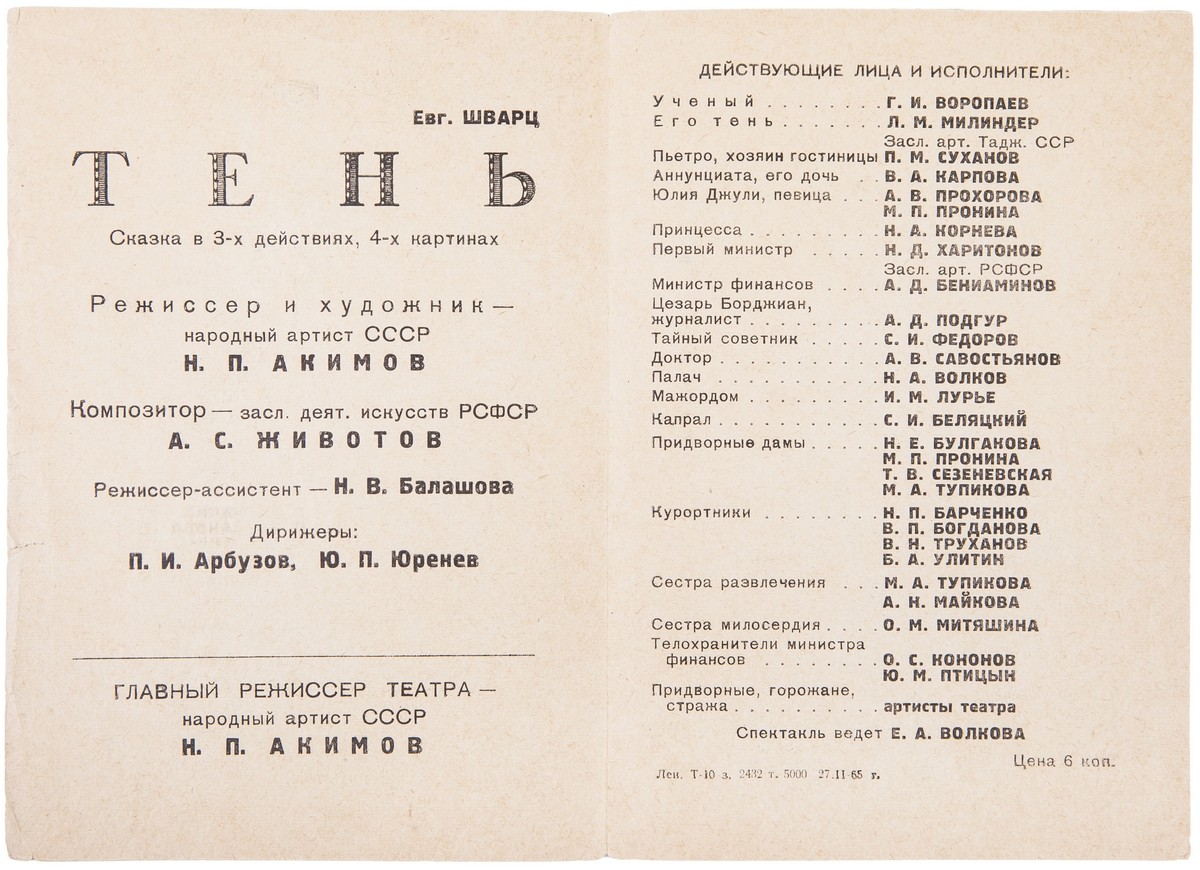 1. Афиша пьесы «Тень». - Л.: 1965. - 98х67 см; 2. Программа пьесы «Тень». - Л.: 1965. - 2 с. - 16х12 см.