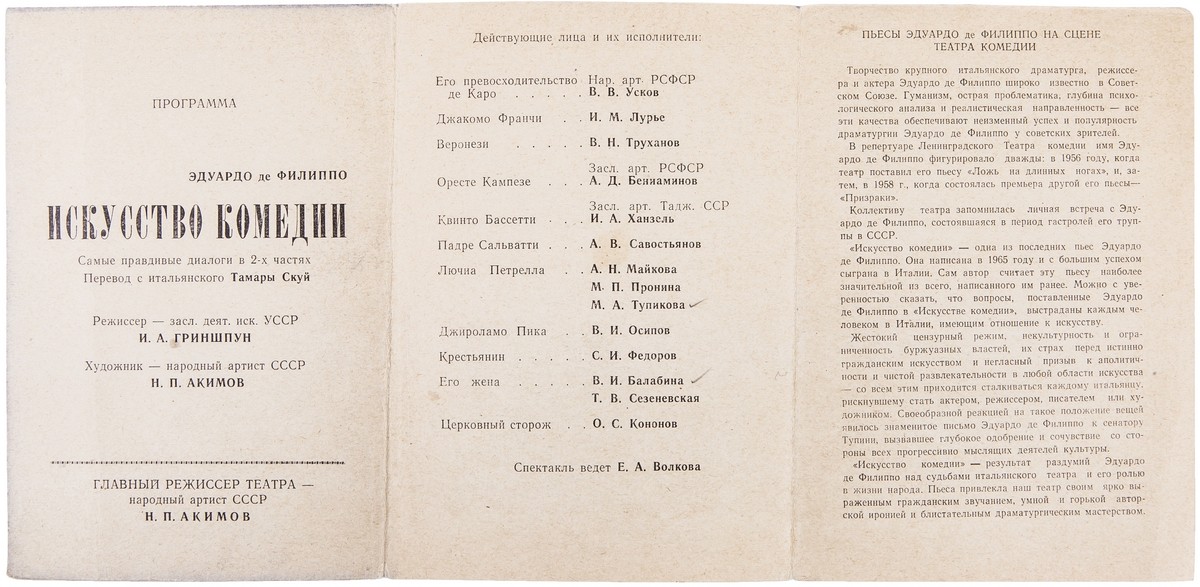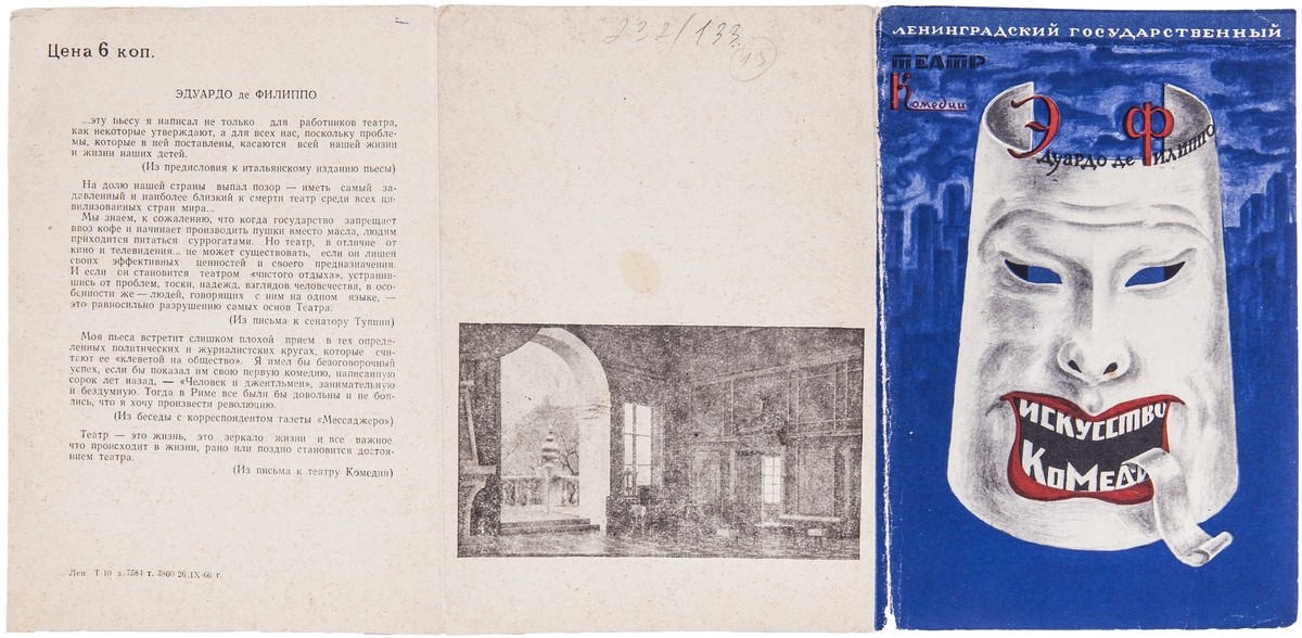 1. Афиша пьесы «Искусство комедии». - Л.: 1966. - 94х65 см; 2. Программа пьесы «Искусство комедии». - Л.: 1966. - 17х12 см.