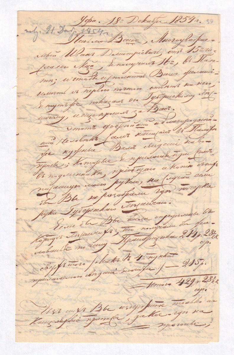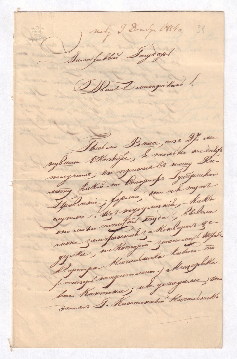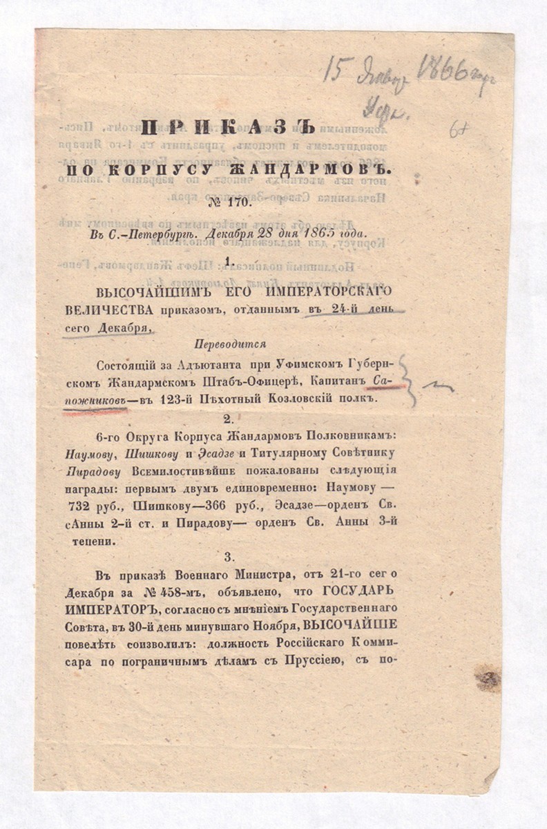 1. Приказ по корпусу жандармов. № 97. 1863. - 1 л.; 22,6х16,2 см. О переводе Чугуевского Уланского полка штабс-ротмистр Сапожников. 2. Приказ по корпусу жандармов. № 170. 1865. - 1 л.; 22,6х14 см. О переводе капитана Сапожникова в 123-й Пехотный козловский полк. 3. Квитанция на 150 рублей на имя Генерал-майора Сапожникова. Главное казначейство. 1894. - 1 л.; 12,5х24 см. 4. Два письма [Сапожникова?] на имя Ивана Дмитриевича. Уфа. 1854. - 4 л.; 21,6х13,3 см.