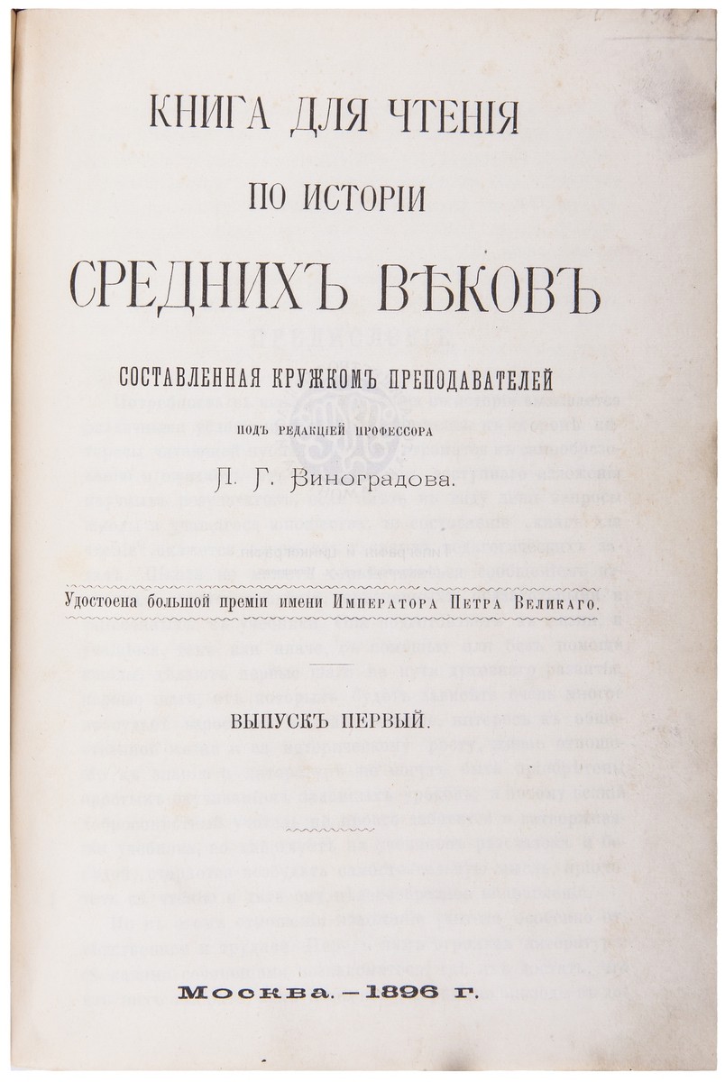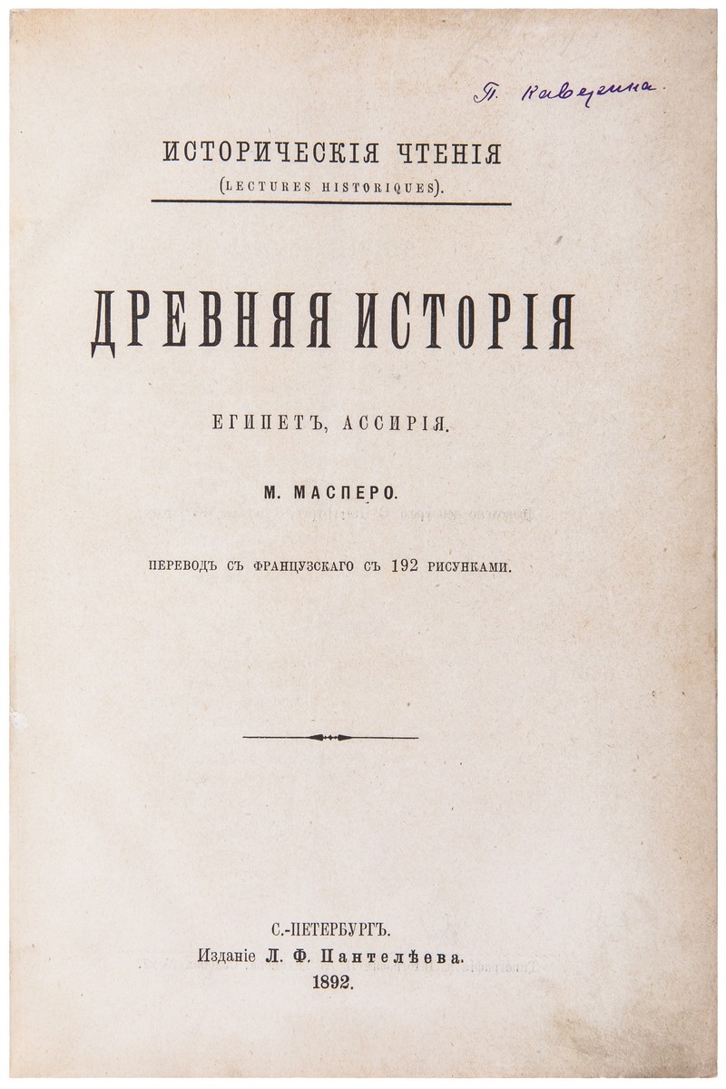 1. Масперо, Г. Древняя история. Египет, Ассирия / М.Масперо: пер. с французского с 192 рисунками. - СПб: Издание Л.Ф. Пантелеева, 1892. - 304 с., ил; 2. Книга для чтения по истории Средних веков. Выпуск первый / Под ред. проф. П.Г.Виноградова, 1896. - 448 с.; 22x15, 5 см.