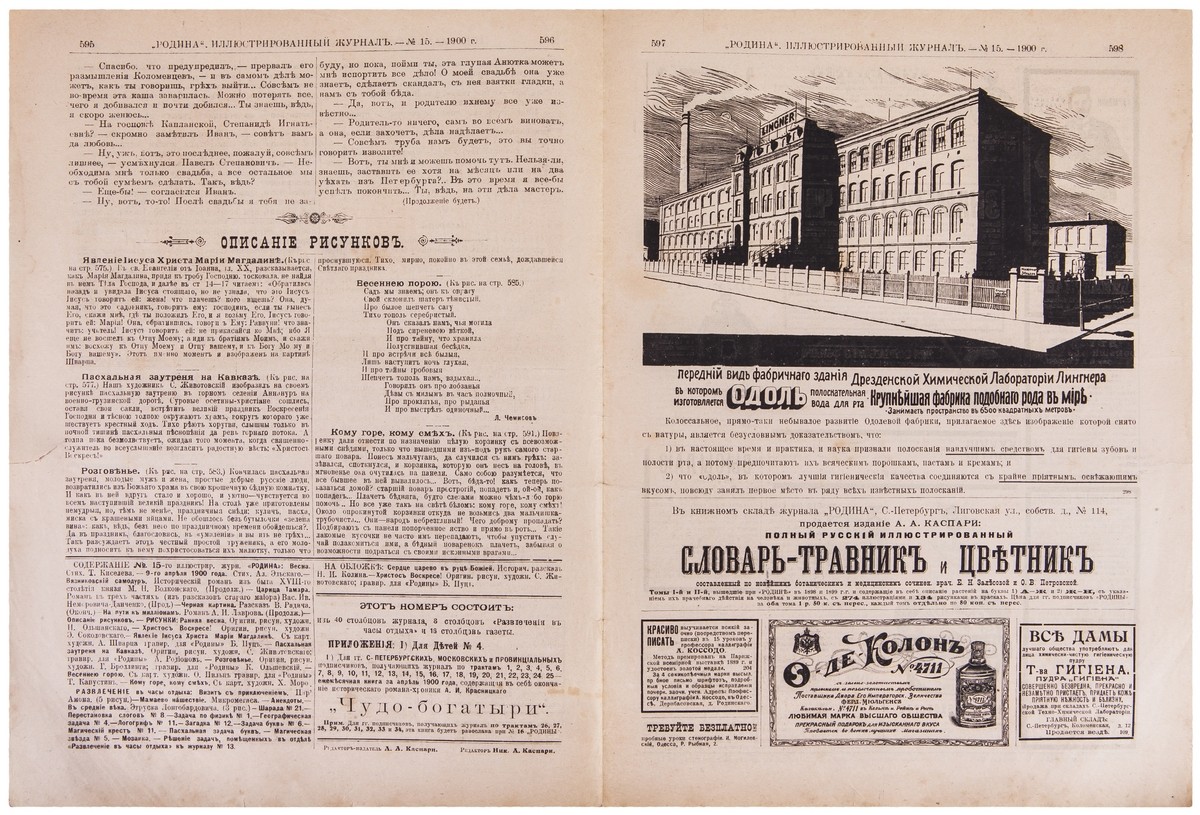 "Родина" — иллюстрированный журнал для семейного чтения. Основан в Санкт-Петербурге в 1879 г. В.А.Захаровым и выходил сначала ежемесячно. В 1886 г. журнал приобрел А.А.Каспари. Со времени перехода издания к А.А.Каспари, журнал начинает печатать ежемесячные приложения («Развлечение», иллюстрированное «Всемирное обозрение», еженедельная политическая и общественная газета «Родина»). На рубеже веков он стал самым распространенным русским иллюстрированным журналом после «Нивы», в т.ч. и благодаря одним из самых модных среди публики приложений 1898–1903 годов «Новые моды и рукоделия». Каспари реформировал «Родину» в еженедельный иллюстрированный журнал, явившись пионером в создании еженедельников нового типа, с отдельными бесплатными приложениями. Такими стали в дальнейшем многие семейные журналы. Журнал издавался до 1917 года.
