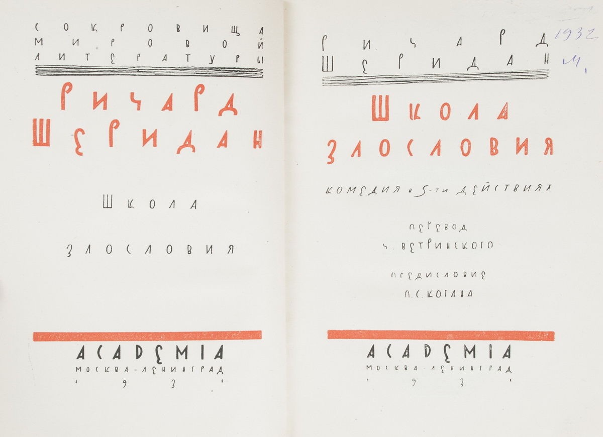 Портрет Ричарда Шеридана. В цельноколенкоровом издательском переплете и иллюстрированной издательской обложке. Оформление книги В.М. Конашевича.