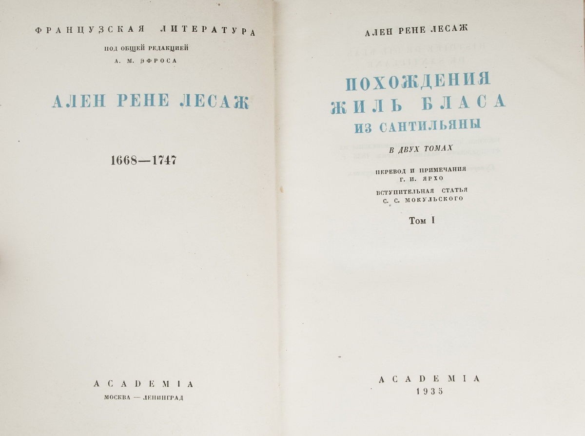 Фронтиспис с портретом Алена Рене Лесажа, многочисленные иллюстрации на отдельных листах, включенных в пагинацию — рисунки Жана Жигу, воспроизведенные из французского издания 1836 года. В двух издательских цельноколенкоровых переплетах и издательских иллюстрированных суперобложках по рисункам А.И. Порета.