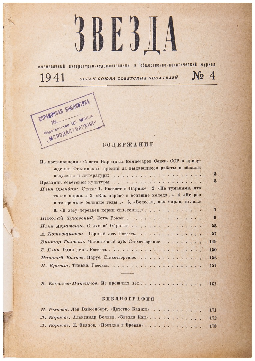 «Звезда» — ежемесячный литературный журнал, издаётся в Петрограде — Ленинграде — Санкт-Петербурге с января 1924 года. Выходил сначала 6 раз в год, с 1927 года выходит ежемесячно. В августе 1946 года журнал подвергся резкой критике, наиболее известный документ которой — постановление Оргбюро ЦК ВКП(б) «О журналах „Звезда“ и „Ленинград“», фактически изгнавшее из литературы Михаила Зощенко и Анну Ахматову.